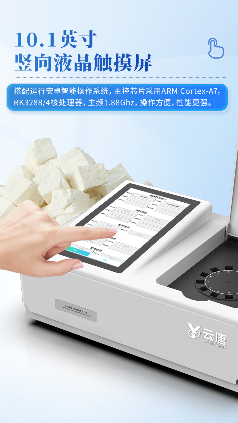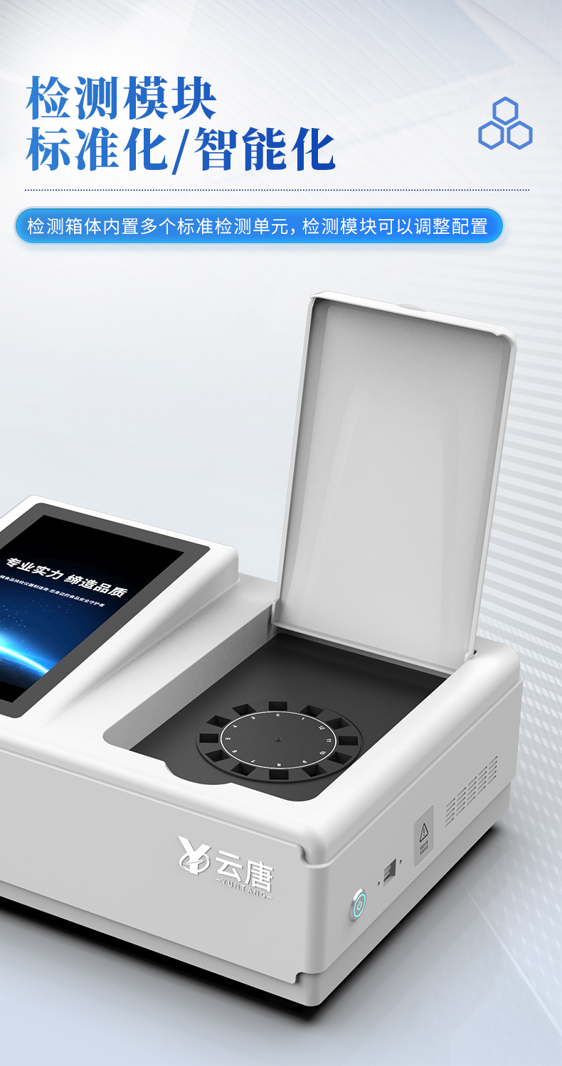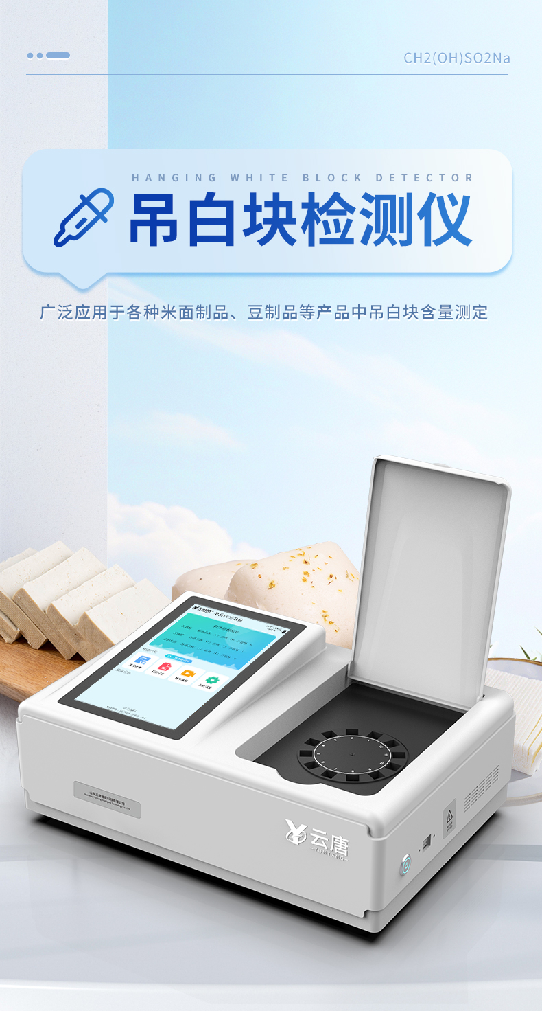 山东云唐智能科技有限公司生产的吊白块检测仪为集成化食品安全快速检测分析设备,采用台式一体化设计,广泛应用于各种米面制品、豆制品等产品中的吊白块含量测定,仪器预留其他项目升级端口,根据日后需求可远程升级检测项目。