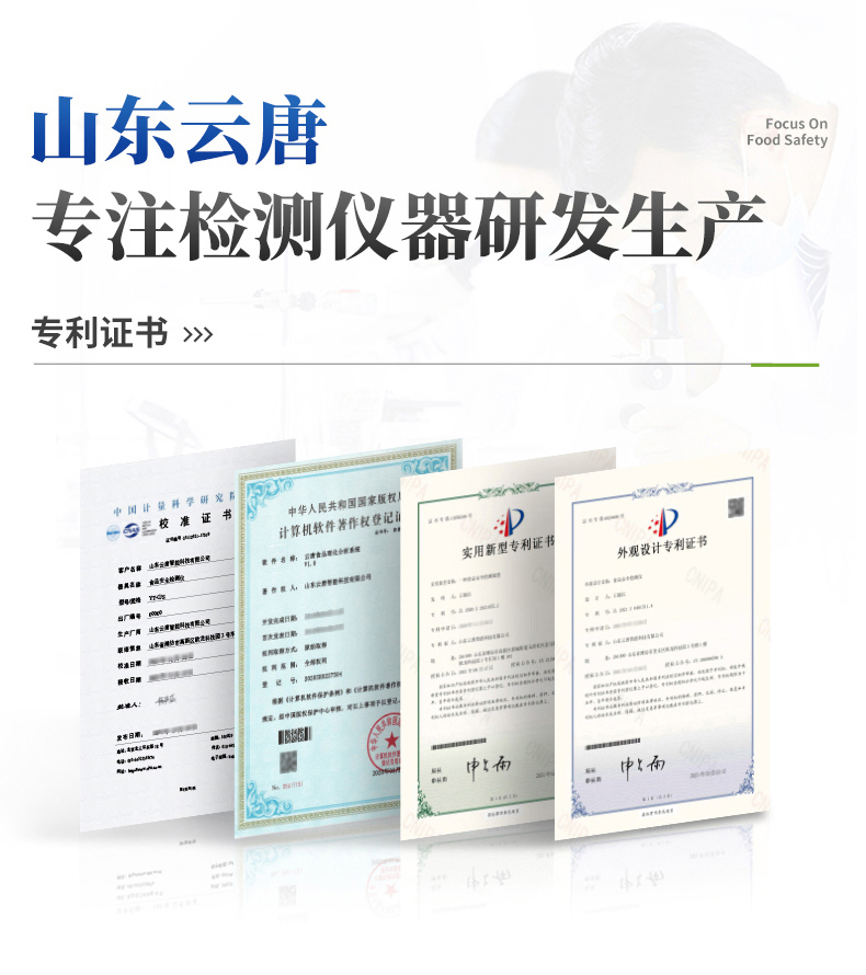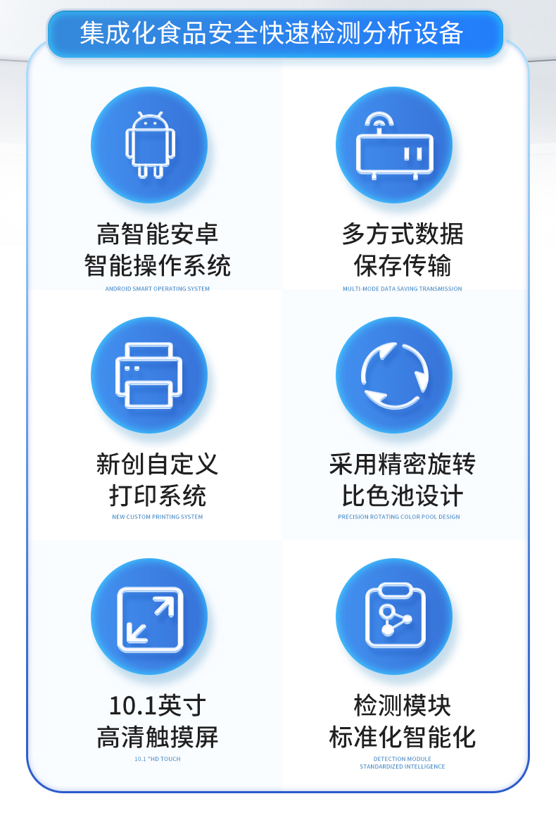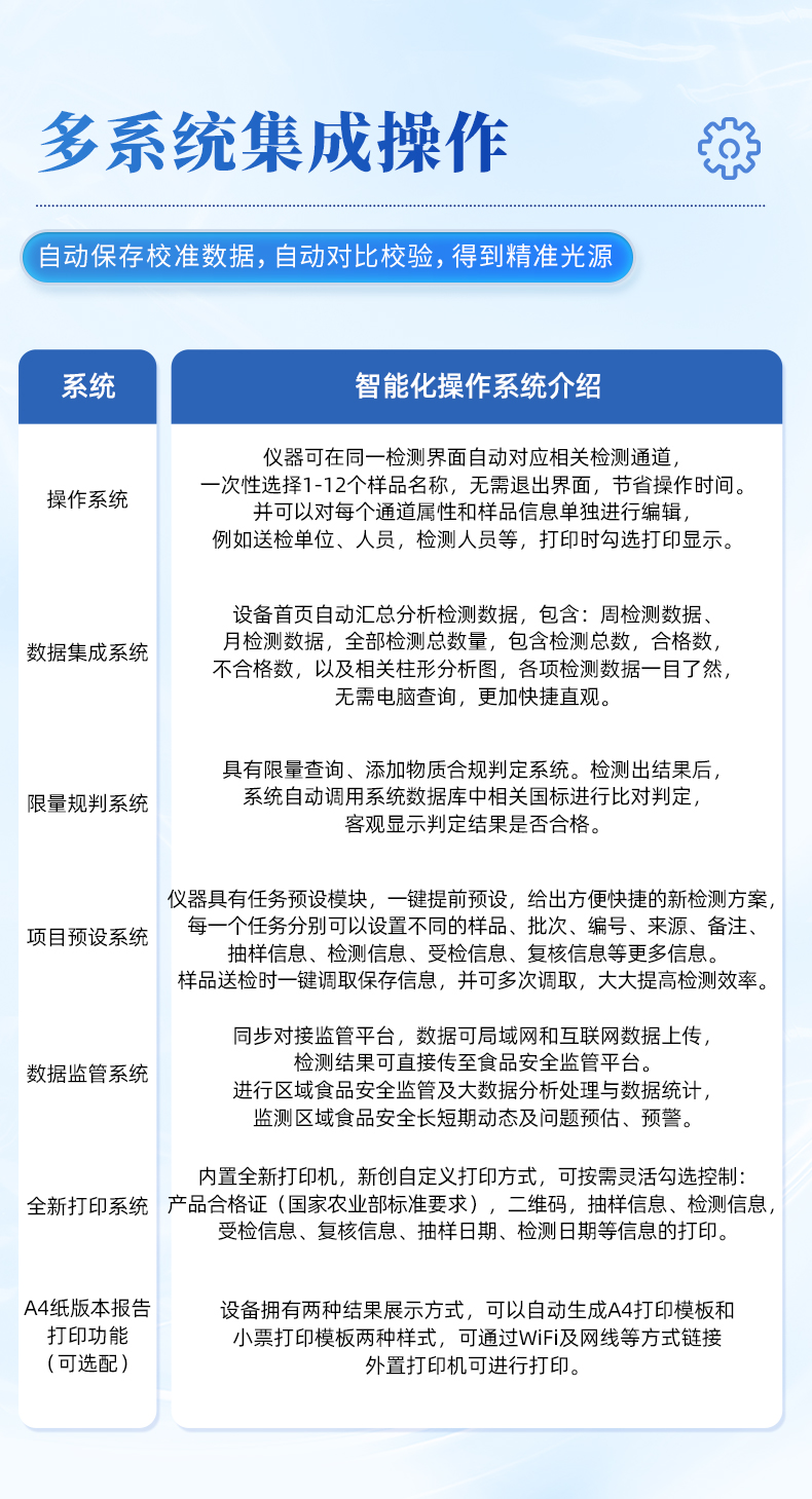 | ◆ 仪器采用台式一体化系统检测技术,将分光光度模块、数字化管理模块、无线通讯模块高度集成于一体,可支持检测60种食品安全检测项目,同时预留升级检测方法。 | 显示屏幕:仪器采用10.1英寸竖向液晶触摸屏显,搭配运行安卓智能操作系统,主控芯片采用ARM Cortex-A7,RK3288/4核处理器,主频1.88Ghz,操作方便,性能更强。 | 检测通道:≥12通道;采用精密旋转比色池设计,使用同芯片同光源校准精度,解决不同光源之间的误差值,1-12通道间误差0.1%,更加准确**。(***:**202022821055.2) | 仪器光源:高精度进口四波长冷光源,每个通道均配置 410、520、590、630nm 波长光源,标配**的光路切换装置,专利光路切换功能可实现64波长,并且所有检测项目可实现所有通道同时检测。 | ◆ 设备可一键校准,自动保存校准数据,自动对比校验,得到精准光源,采用数据库+SP+文件三种方式存储数据,光源数据永不丢失,方便每一次使用。 | 通讯接口:配备无线通信模块、4G(APN)通讯模块、蓝牙传输,同时具有双USB接口以及RJ45网线接口,可以多方式实现数据保存及数据传输。 | 存储方式:支持U盘存储,标准USB接口,免驱动安装。检测结果存储容量20万条以上,可生成Excel表格进行拷贝,并具有登录保护功能。 | ◆ 智能化操作系统: | 1、操作系统:仪器可在同一检测界面自动对应相关检测通道,一次性选择1-12个样品名称,无需退出界面,节省操作时间。并可以对每个通道属性和样品信息单独进行编辑,例如送检单位、人员,检测人员等,打印时勾选打印显示。 | 2、数据集成系统:设备首页自动汇总分析检测数据,包含:周检测数据、月检测数据,全部检测总数量,均包含检测总数,合格数,不合格数,以及相关柱形分析图,各项检测数据一目了然,无需电脑查询,更加快捷直观。 | 3、数据库系统:十几项数据库分类管理仪器:包含项目类型、项目数据、检测数据、历史记录、国标信息、曲线信息、采样信息、检测信息、受检信息、复核信息、图表信息、光源校准信息、打印样式信息、样品库信息等等,数据库之间互相协调联动保证数据的真实完整性。同时产品数据库以及历史检测记录支持一键检索功能。 | 4、限量规判系统:具有限量查询、添加物质合规判定系统。检测出结果后,系统自动调用系统数据库中相关国标进行比对判定,客观显示判定结果是否合格。 | 5、项目预设系统:仪器具有任务预设模块,一键提前预设,给出方便快捷的新检测方案,每一个任务分别可以设置不同的样品、批次、编号、来源、备注、抽样信息、检测信息、受检信息、复核信息等更多信息。样品送检时一键调取保存信息,并可多次调取,大大提高检测效率。 | 6、数据监管系统:同步对接监管平台,数据可局域网和互联网数据上传,检测结果可选择直接传至食品安全监管平台。进行区域食品安全监管及大数据分析处理与数据统计,检测区域食品安全长短期动态,达到食品安全问题预估、预警。 | 7.1、全新打印系统:内置全新打印机,新创自定义打印方式,可按需灵活勾选控制:二维码,抽样信息、检测信息,受检信息、复核信息、抽样日期、检测日期等信息的打印。 | 7.2、A4纸版本报告打印功能:设备拥有两种结果展示方式,可以自动生成A4打印模板和小票打印模板两种样式,可通过WiFi及网线等方式链接外置打印机可进行打印。 | 供电模式:仪器交直流两用,直流12V供电,可连接车载电源,可配6ah大容量充电锂电池,电量可实时显示,方便户外流动测试。 | ◆ 仪器具备远程升级功能,可定向分客户分仪器更新,开机后自动更新,并可持续性免费更新系统版本,无需像传统产品返厂更新,节省时间及人力成本并避免了物流运输返厂升级导致设备损坏的潜在风险。 |