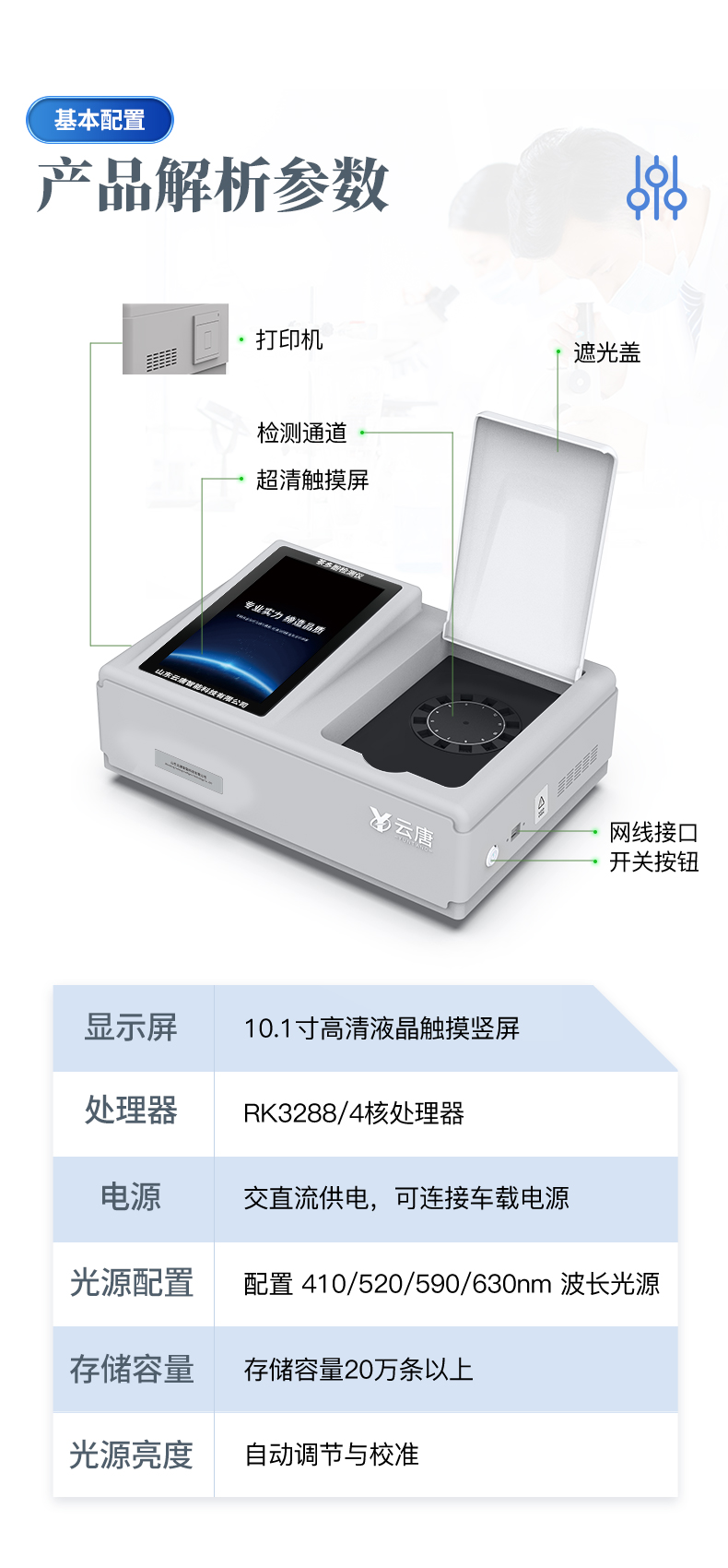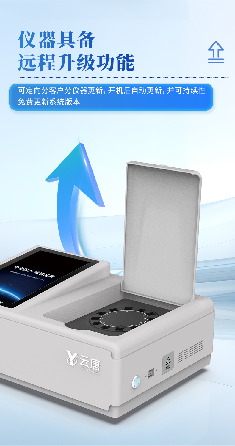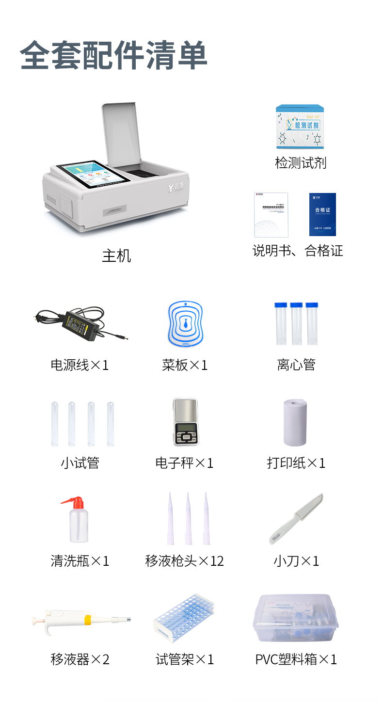 | ◆ 仪器采用台式一体化系统检测技术,将分光光度模块、数字化管理模块、无线通讯模块高度集成于一体,可支持检测60种食品安全检测项目,同时预留升级检测方法。 | 显示屏幕:仪器采用10.1英寸竖向液晶触摸屏显,搭配运行安卓智能操作系统,主控芯片采用ARM Cortex-A7,RK3288/4核处理器,主频1.88Ghz,操作方便,性能更强。 | 检测通道:≥12通道;采用精密旋转比色池设计,使用同芯片同光源校准精度,解决不同光源之间的误差值,1-12通道间误差0.1%,更加准确**。(***:**202022821055.2) | 仪器光源:高精度进口四波长冷光源,每个通道均配置 410、520、590、630nm 波长光源,标配**的光路切换装置,专利光路切换功能可实现64波长,并且所有检测项目可实现所有通道同时检测。 | ◆ 设备可一键校准,自动保存校准数据,自动对比校验,得到精准光源,采用数据库+SP+文件三种方式存储数据,光源数据永不丢失,方便每一次使用。 | 通讯接口:配备无线通信模块、4G(APN)通讯模块、蓝牙传输,同时具有双USB接口以及RJ45网线接口,可以多方式实现数据保存及数据传输。 | 存储方式:支持U盘存储,标准USB接口,免驱动安装。检测结果存储容量20万条以上,可生成Excel表格进行拷贝,并具有登录保护功能。 | ◆ 智能化操作系统: | 1、操作系统:仪器可在同一检测界面自动对应相关检测通道,一次性选择1-12个样品名称,无需退出界面,节省操作时间。并可以对每个通道属性和样品信息单独进行编辑,例如送检单位、人员,检测人员等,打印时勾选打印显示。 | 2、数据集成系统:设备首页自动汇总分析检测数据,包含:周检测数据、月检测数据,全部检测总数量,均包含检测总数,合格数,不合格数,以及相关柱形分析图,各项检测数据一目了然,无需电脑查询,更加快捷直观。 | 3、数据库系统:十几项数据库分类管理仪器:包含项目类型、项目数据、检测数据、历史记录、国标信息、曲线信息、采样信息、检测信息、受检信息、复核信息、图表信息、光源校准信息、打印样式信息、样品库信息等等,数据库之间互相协调联动保证数据的真实完整性。同时产品数据库以及历史检测记录支持一键检索功能。 | 4、限量规判系统:具有限量查询、添加物质合规判定系统。检测出结果后,系统自动调用系统数据库中相关国标进行比对判定,客观显示判定结果是否合格。 | 5、项目预设系统:仪器具有任务预设模块,一键提前预设,给出方便快捷的新检测方案,每一个任务分别可以设置不同的样品、批次、编号、来源、备注、抽样信息、检测信息、受检信息、复核信息等更多信息。样品送检时一键调取保存信息,并可多次调取,大大提高检测效率。 | 6、数据监管系统:同步对接监管平台,数据可局域网和互联网数据上传,检测结果可选择直接传至食品安全监管平台。进行区域食品安全监管及大数据分析处理与数据统计,检测区域食品安全长短期动态,达到食品安全问题预估、预警。 | 7.1、全新打印系统:内置全新打印机,新创自定义打印方式,可按需灵活勾选控制:二维码,抽样信息、检测信息,受检信息、复核信息、抽样日期、检测日期等信息的打印。 | 7.2、A4纸版本报告打印功能:设备拥有两种结果展示方式,可以自动生成A4打印模板和小票打印模板两种样式,可通过WiFi及网线等方式链接外置打印机可进行打印。 | 供电模式:仪器交直流两用,直流12V供电,可连接车载电源,可配6ah大容量充电锂电池,电量可实时显示,方便户外流动测试。 | ◆ 仪器具备远程升级功能,可定向分客户分仪器更新,开机后自动更新,并可持续性免费更新系统版本,无需像传统产品返厂更新,节省时间及人力成本并避免了物流运输返厂升级导致设备损坏的潜在风险。 |