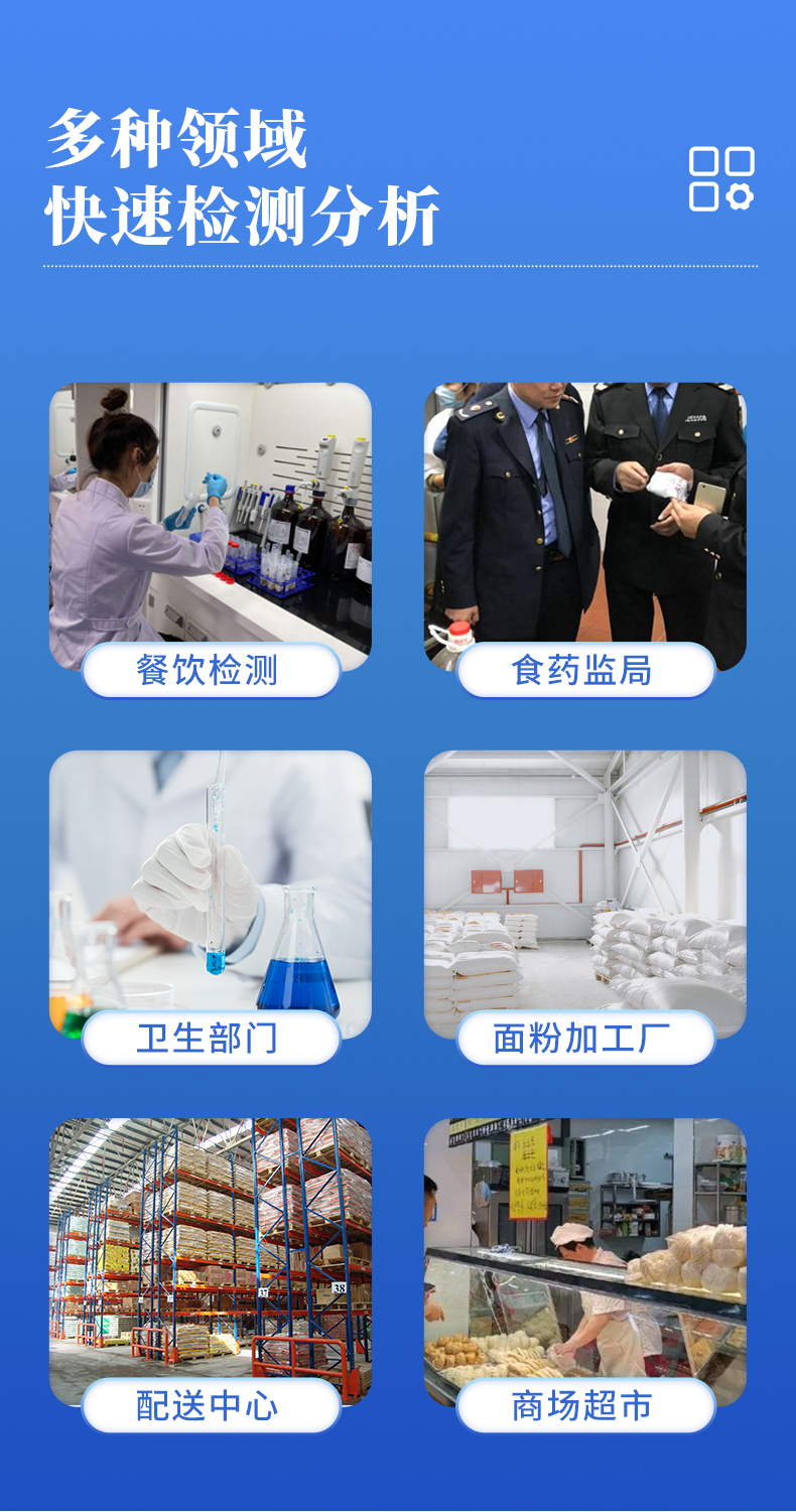 该吊白块检测仪为集成化食品安全快速检测分析设备,目前已于餐饮检测、食药监局、卫生部门、面粉加工厂、配送中心、商场超市、质量监督检验、工商管理等单位广泛使用。