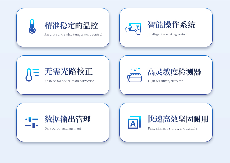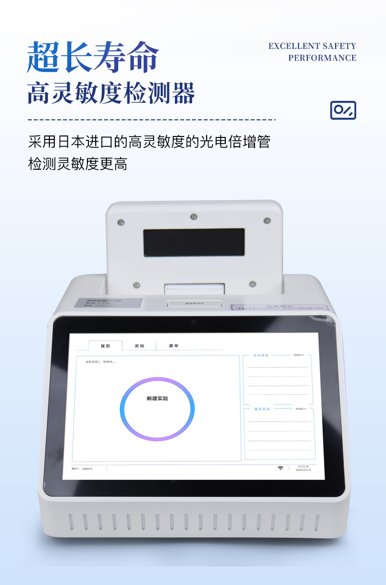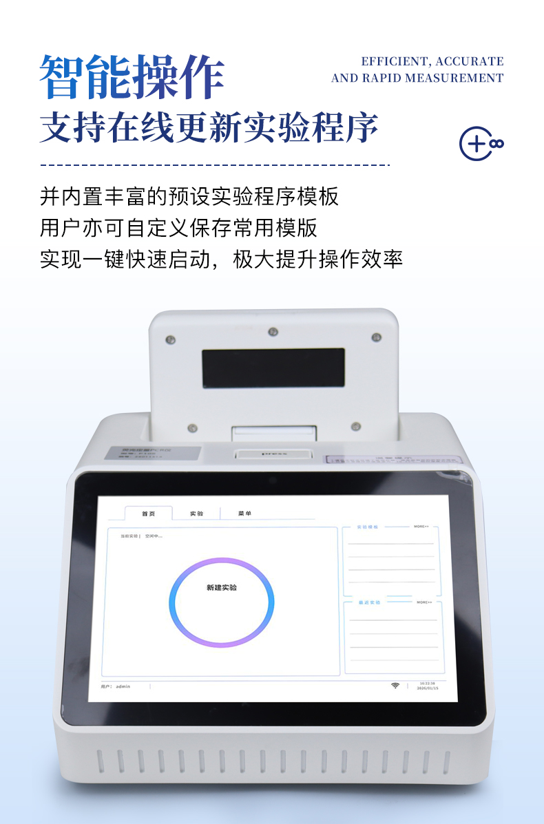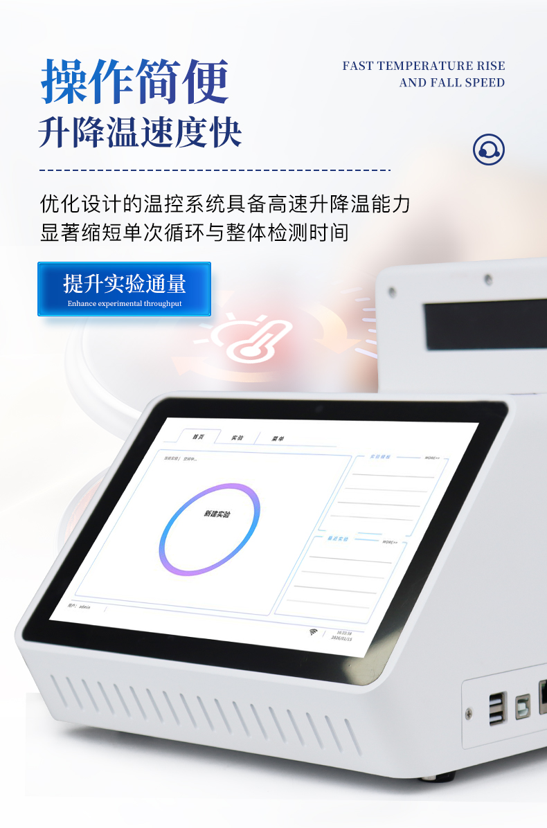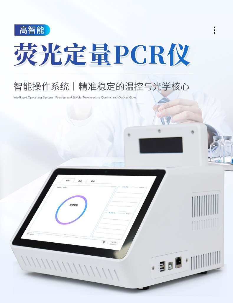 | 1.智能操作系统,实验尽在掌握 | A双模式灵活控制:支持通过仪器触摸屏独立运行,也支持通过电脑软件进行远程控制与数据管理,适应不同实验场景需求。 | B程序更新与预设:支持在线更新实验程序,并内置丰富的预设实验程序模板,用户亦可自定义保存常用模版,实现一键快速启动,极大提升操作效率。 | C极简启动体验(可选配):可定制集成摄像头扫描系统,用户只需扫描样品板或程序卡的二维码,即可自动识别并调用对应实验程序,简化流程,避免人为设置错误。 | D操作简单:无论是触摸屏界面还是电脑软件,均设计得直观易懂,新用户也能快速上手。预置常用程序模板,进一步简化操作流程。 | 2.精准稳定的温控与光学核心 | A长久精准的温控系统:采用进口***TEC半导体制冷模块,控温精准(±0.1°C),孔间温度均匀性**(≤±0.3°C)。系统稳定性卓越,长期使用性能衰减小,校准周期长达数年,显著降低维护成本与运营中断。 | B免维护的灵敏光学系统:配备4个独立LED光源与4个独立光电二极管检测器,实现四通道荧光同步精准检测。采用超长寿命进口光源,设计寿命期内免维护,无需额外校准或更换,保障检测结果长期一致性与高灵敏度。 | C卓越的数据质量:实验线性相关性高(R²≥0.999),重复性优异(孔间CV值低),确保定量结果准确可靠,数据置信度高。 | 3.**便捷的数据与输出管理 | A多重数据导出方式:支持通过USB存储设备直接拷贝,或经由Wi-Fi无线网络传输数据至本地服务器或云端,方便灵活,满足各类实验室数据管理习惯。 | B丰富的报告导出与打印:支持生成并导出多种格式(如PDF、Excel)的实验报告。仪器兼容USB热敏打印机、蓝牙无线打印机及常规A4打印机,可直接在仪器上或通过电脑一键导出并打印专业报告,便于结果存档与即时分享。 | 4.快速**与坚固耐用 | A升降温速度快:优化设计的温控系统具备高速升降温能力,显著缩短单次循环与整体检测时间,提升实验通量。 | B超长使用寿命:核心部件均选用工业级耐用材料与设计,整机运行稳定可靠,致力于为用户提供长久的投资回报。 | 三、应用场景基础科学研究、病原体检测、肉制品掺假、转基因检测、食品安全检测、药物开发及合理用药、基因表达、水体监测、松材线虫检测、宠物检测、养殖业疫病检测 |
