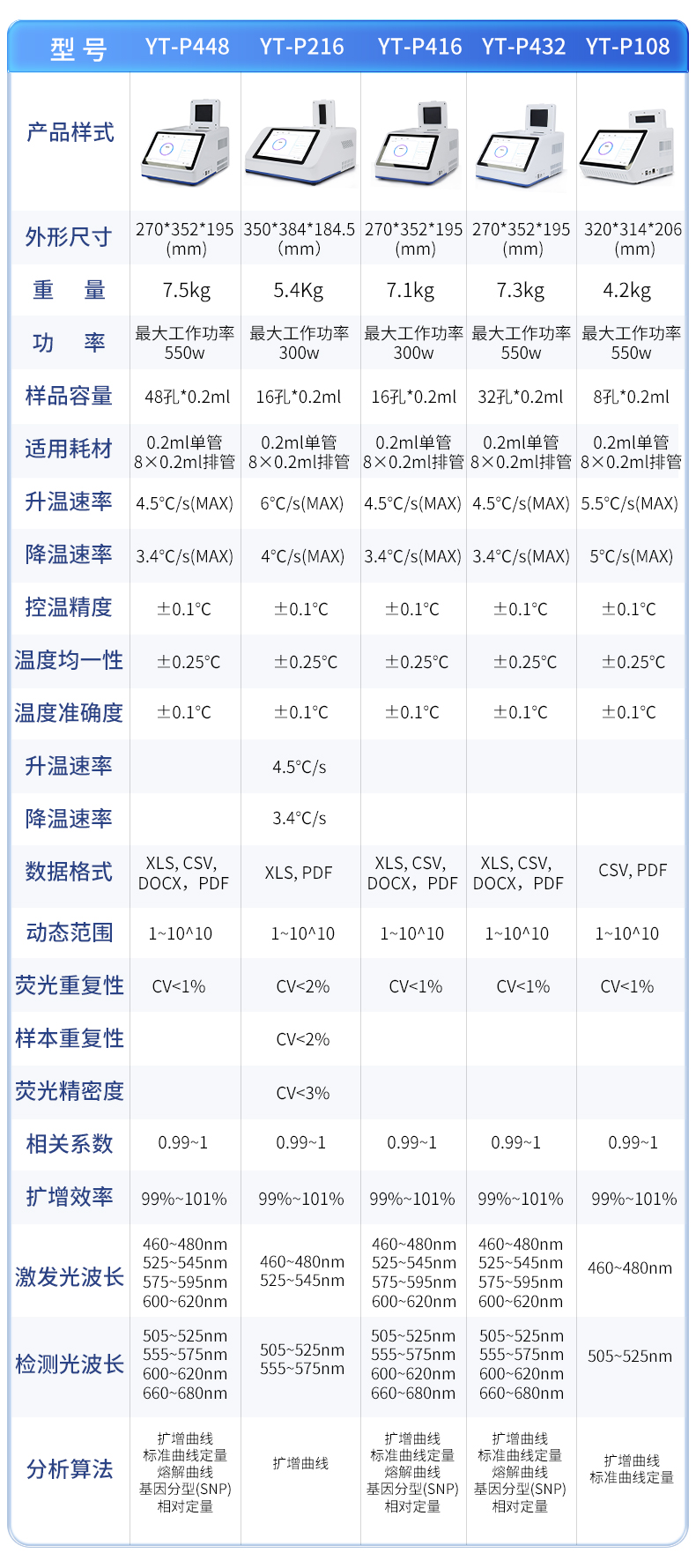 | 基本性能 | 外形尺寸:318*425*217.5 (mm) | 重量:12.3 Kg | 电源:220V | 功率:**工作功率960w | 操作系统:自带Android操作系统 | 外接电脑:外接windows电脑(win7系统以上) | 系统语言:中英文实时切换 | 通信接口:方形USB | 操作环境参数 | 操作环境温度:18~35℃ | 操作环境相对湿度:0%~85% | 运输及储存温度:-20~55℃ | 运输及储存相对湿度:0%~85% | 系统性能 | 样品容量:96孔*0.2ml | 样品容积:15~100ul | 适用耗材:0.2ml单管、8×0.2ml排管、96孔板 | 控温范围:4~99℃ | 热盖温度:30℃-108℃(默认105℃,热盖温度可调) | 温控方式:高性能进口半导体 | 梯度控温:6模块梯度控温,**温差支持35℃ | 升温速率:4.5℃/s(MAX) | 降温速率:3.4℃/s(MAX) | 控温精度:±0.1℃ | 温度均一性 :±0.25℃ | 温度准确度 :±0.1℃ | 操作功能:预设项目和分析参数,操作简单方便 | 报告:支持报告自定义模块,96孔分项目打印 | 分析功能:具多重qPCR数据分析功能,可同时检测4个检测通道 | 断电保护:可以一键重启中断的实验 | 仪器信息:拥有故障记录,分析,提示的功能,更方便远程解决问题 | 分析算法:扩增曲线,标准曲线定量、熔解曲线,基因分型(SNP),相对定量 | 支持HRM检测:支持 | 数据导出:可将实验结果以图形和表格的形式直接导出;详细的数据报告内容包括实验条件,数据坐标和表格,数据分析参数。 | 数据格式:XLS, CSV, DOCX,PDF | TouchDown功能:支持时间和温度递增递减模式 | 荧光检测系统性能 | 检测灵敏度:可检测单拷贝基因 | 动态范围:1~10^10 | 荧光重复性:CV<1%(使用某品牌试剂做96孔均一性实验,96个孔的Ct差值保持在0.5以内,CV保持在1%以内。) | 相关系数:0.99~1(每种浓度3个重复,梯度曲线的相关系数>0.99,扩增效率保持在99%~101%之间) | 扩增效率:99%~101% | 可信度:区分1000与2000拷贝浓度差异 | 激光光源:大功率LED(免维护,寿命长) | 检测器:高灵敏度光电传感器 | 激发和检测传播介质:耐高温专业导光光纤 | 激发光波长:460nm~480nm , 525nm~545nm, 575nm~595nm ,600nm~620nm | 检测光波长:505nm~525nm , 555nm~575nm , 600nm~620nm , 660nm~680nm |