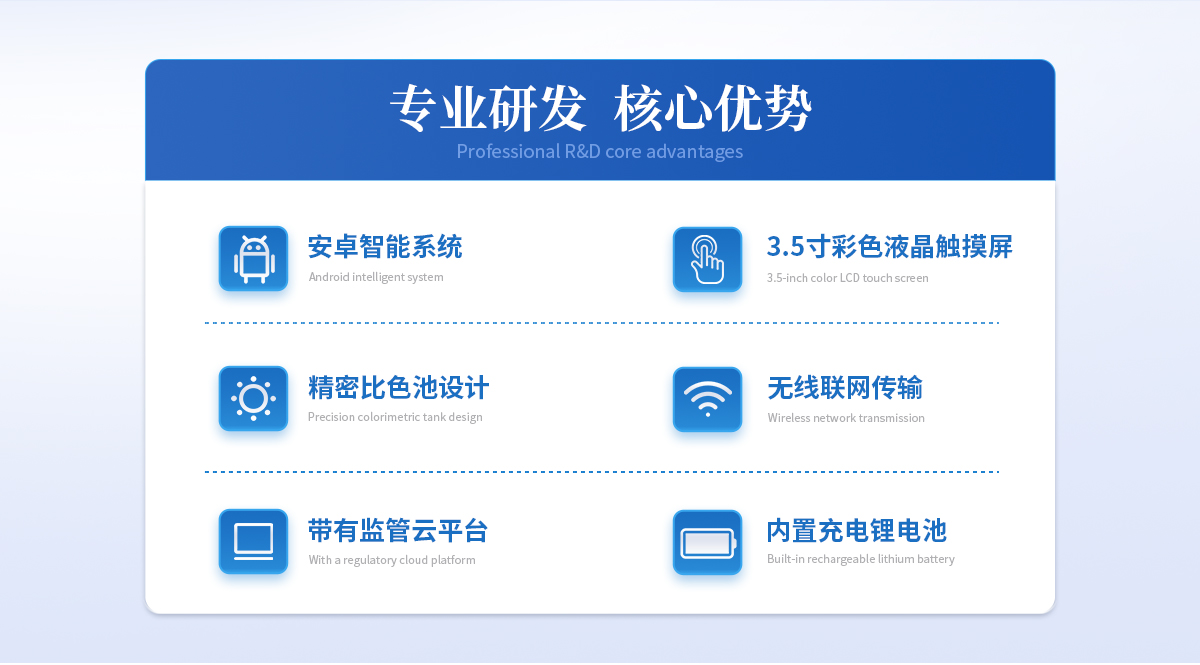 | ①安卓智能系统,操作更佳简便快捷; | ②配置云监控平台,检测结果可直接无线传至平台,进行水质长短期分析,辅助管理。 | ③内置操作流程、操作简单、无需培训、直接上手; | ④检测速度更快,现场读取数据; | ⑥便携式体积小,重量轻,方便户外检测; | ⑦外形小巧美观,工作稳定免维护,具有较好的性价比; | ⑧采用进口冷光源,光学性能稳定,寿命长达10万小时; | ⑨交直流两用,内置充电锂电池,环保耐用可支持连续室内外工作。 |