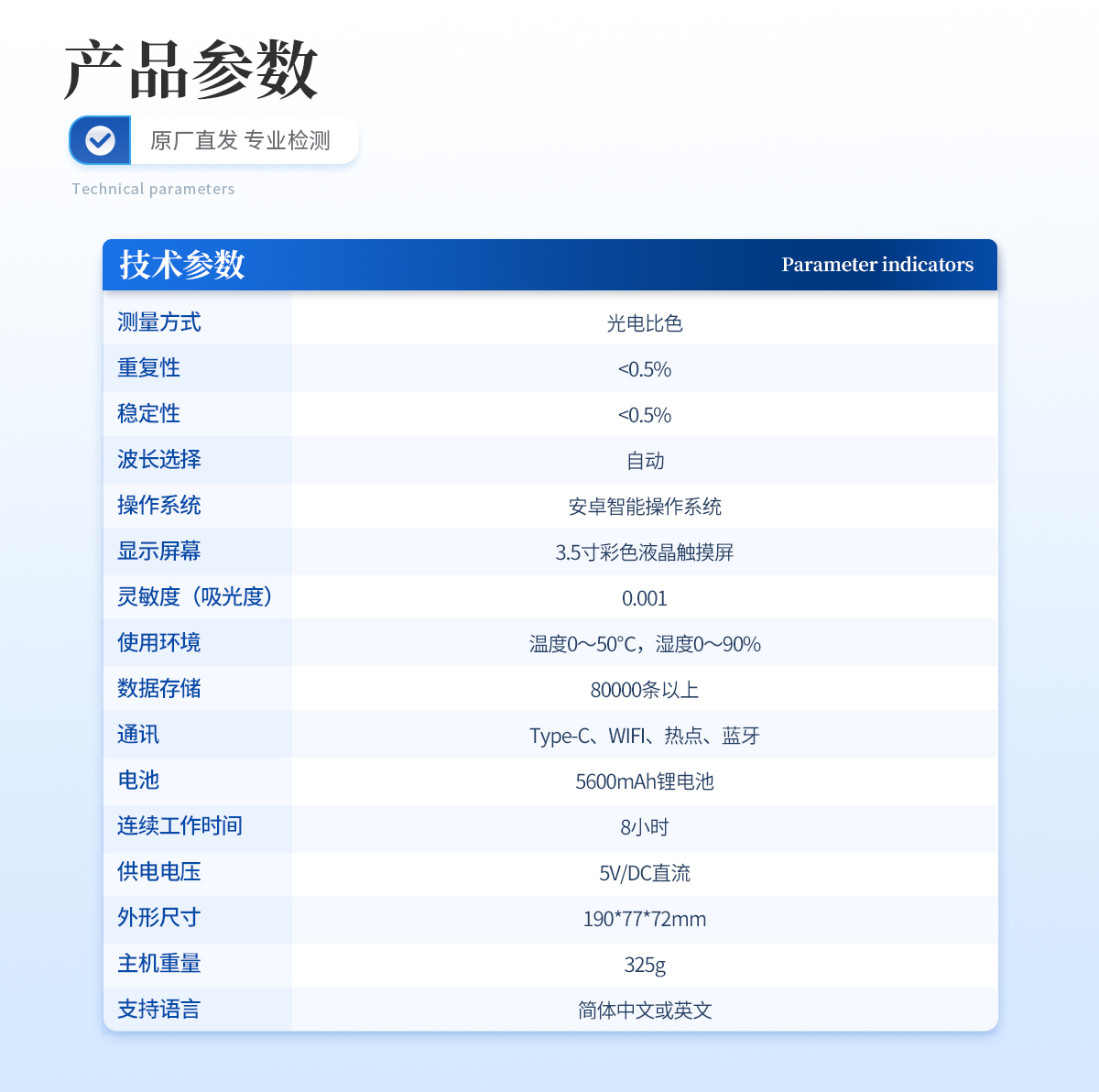 | 亚氯酸盐:0.05~2.5mg/L; | 参考方法:碘量法原理 | 测量方式:光电比色 | 重复性:<0.5% | 稳定性:<0.5% | 波长选择:自动 | 操作系统:安卓智能操作系统 | 显示屏幕:3.5寸彩色液晶触摸屏 | 灵敏度(吸光度):0.001 | 使用环境:温度0~50℃,湿度0~90% | 数据存储:80000条以上 | 通讯:Type-C、WIFI、热点、蓝牙 | 电池:5600mAh锂电池 | 连续工作时间:8小时 | 供电电压:5V/DC直流 | 尺寸:190mm*77mm*72mm | 主机重量:325g | 支持语言:简体中文或英文 |