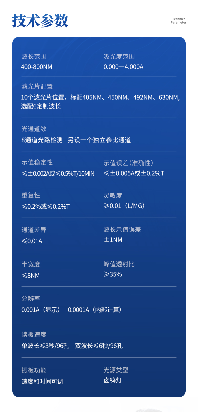 | 光源:12V,20W 卤素灯 | 光谱范围:400nm到750nm 具有单波长,双波长设定 | 比色检测器:8个硅光二极管 | 滤光片数量:标准配置滤光片405,450,492,630nm | 读板速度:单波长6秒,双波长10秒 | 吸光度范围:0.000到3.500Abs | 分辨率:0.001Abs | 吸光度稳定性:405nm处,间隔10分钟检测吸光度漂移≤0.003Abs | 准确度:ΔA≤±0.01Abs(0≤A<1.0Abs);≤2.5%(1.0Abs≤A≤2.5Abs); | 灵敏度:≥0.010Abs | 重复性:≤0.2%(0≤A≤1.5Abs);≤1.0%(1.5Abs ); | 通道差异:8个通道读数的极差值≤0.02Abs | 线性:线性范围0.000-2.500Abs,相关系数≥0.999 |