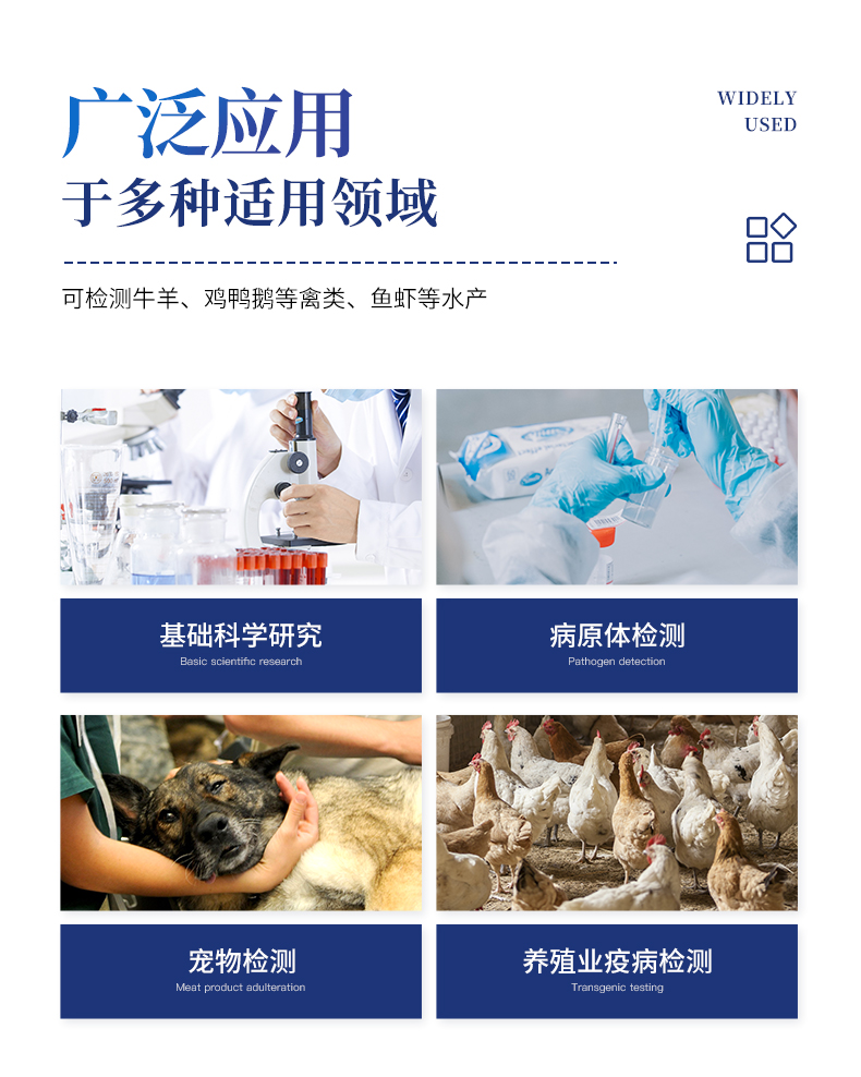 | ◆ 基础科学研究、病原体检测、宠物检测、养殖业疫病检测(牛羊、鸡鸭鹅等禽类、鱼虾等水产) |