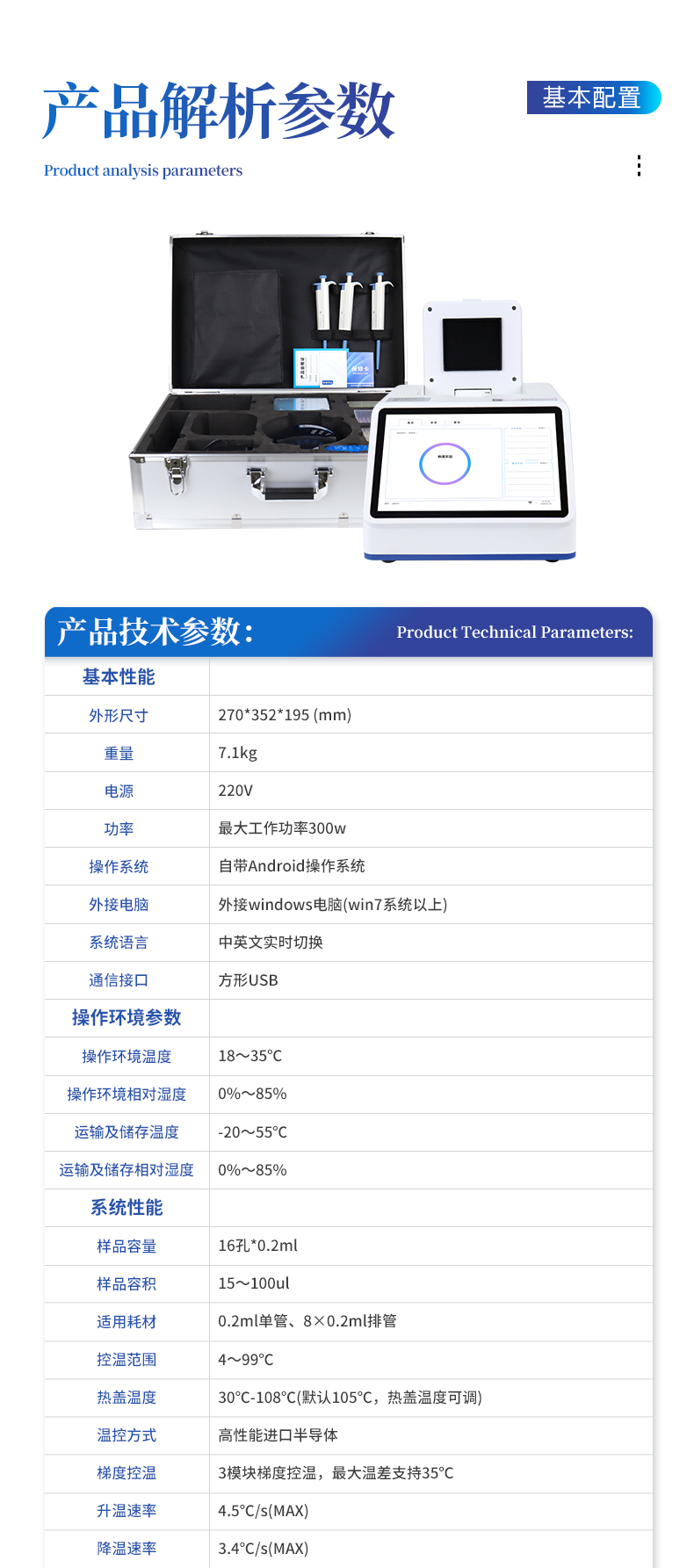 | ◆ 动物疫病检测仪由四通道16孔荧光定量pcr仪、便携式配件箱组成。 |