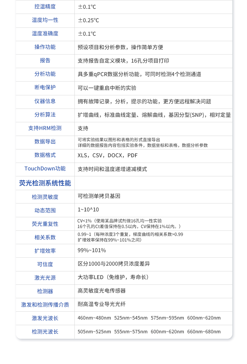 | ◆ 采用高规格铝合金样品槽,热导性好,耐腐蚀抗氧化,Peltier加热控温,全面的密封设计。无论是样品溶液还是冷凝水,都不会渗漏到样品槽下面的帕尔帖控温元件以及其他电子元件,可有效延长仪器的使用寿命。 | ◆ 采用高精度PT1000温度传感器,控温精度达到0.01℃,充分保证控温的准确度。 | 样品通量:0.2ml单管、0.2ml八联管。 | 开放的试剂耗材系统:可以选任何品牌的试剂,适用于标准的0.2ml单管、0.2ml八联管。 | ◆ 采用蓝色、绿色、红色和黄色四个高强度宽光谱长寿命LED固态光源,确保在整个光谱检测范围内都有很强的光强,提高检测灵敏度,而且不发热,使用寿命长,终身免维护。 | 高灵敏度检测器:采用日本进口的高灵敏度的光电倍增管,检测灵敏度更高。 | 无需光路校正:扫描系统能确保每孔的信号激发和检测光程都完全一致,无需光路校正,因此无需额外占用一个校正通道,可以实现真正的四通道基因检测。★ | 通道数:配置4通道。 | 通道串扰:采用高精度窄波带滤光片,极大程度减少通道串扰,软件也可以修正串扰参数。 | 检测灵敏度:能检测到单拷贝DNA模板,能清晰区分1000拷贝和2000拷贝的质粒DNA | 线性检测范围:10个数量级★ | ◆ 支持常用荧光染料和探针检测方法,如SYBR Green I,Eva Green,Taqman,FRET,Molecular Beacons,Scorpions,Amplifluor等 | 模块温度范围:4-99℃ | 操控模式:系统屏幕自带的PCR操作系统或Windows电脑★ | 接口:电脑USB连接 | 工作噪音:静音技术,运行时**的工作噪音不超过60 dB | ◆ 操作分析软件 | ◆ 1可以在运行程序后在定义样品孔,节省实验时间 | ◆ 2运行程序时可以同时打开其他实验数据结果进行查阅分析 | ◆ 3软件自动计算基线范围和自动设置阈值线,给用户提供可靠准确的数据结果 | ◆ 4实验程序设置信息和检测结果可直接打印成实验报告,支持XLS,CSV,WORD等多种文件格式和数据样式导出★ | ◆ 5同一批实验的结果可以分组进行独立的数据分析,*多可分成2个组 | ◆ 6提供中英文软件界面。★ | ◆ 7软件可以无限制安装在多台电脑上,无需付费购买使用权,终身可免费升级。★ | ◆ 仪器技术指标 | ◆ 基本性能 | ◆ 外形尺寸 270*352*195 (mm) | ◆ 重量 7.1kg | ◆ 电源 220V | ◆ 功率 **工作功率300w | ◆ 操作系统 自带Android操作系统 | ◆ 外接电脑 外接windows电脑(win7系统以上) | ◆ 系统语言 中英文实时切换 | ◆ 通信接口 方形USB | ◆ 操作环境参数 | ◆ 操作环境温度 18~35℃ | ◆ 操作环境相对湿度 0%~85% | ◆ 运输及储存温度 -20~55℃ | ◆ 运输及储存相对湿度 0%~85% | ◆ 系统性能 | ◆ 样品容量 16孔*0.2ml | ◆ 样品容积 15~100ul | ◆ 适用耗材 0.2ml单管、8×0.2ml排管 | ◆ 控温范围 4~99℃ | ◆ 热盖温度 30℃-108℃(默认105℃,热盖温度可调) | ◆ 温控方式 高性能进口半导体 | ◆ 梯度控温 3模块梯度控温,**温差支持35℃ | ◆ 升温速率 4.5℃/s(MAX) | ◆ 降温速率 3.4℃/s(MAX) | ◆ 控温精度 ±0.1℃ | ◆ 温度均一性 ±0.25℃ | ◆ 温度准确度 ±0.1℃ | ◆ 操作功能 预设项目和分析参数,操作简单方便 | ◆ 报告 支持报告自定义模块,16孔分项目打印 | ◆ 分析功能 具多重qPCR数据分析功能,可同时检测4个检测通道 | ◆ 断电保护 可以一键重启中断的实验 | ◆ 仪器信息 拥有故障记录,分析,提示的功能,更方便远程解决问题 | ◆ 分析算法 扩增曲线,标准曲线定量、熔解曲线,基因分型(SNP),相对定量 | ◆ 支持HRM检测 支持 | ◆ 数据导出 可将实验结果以图形和表格的形式直接导出;详细的数据报告内容包括实验条件,数据坐标和表格,数据分析参数。 | ◆ 数据格式 XLS, CSV, DOCX,PDF | ◆ TouchDown功能 支持时间和温度递增递减模式 | ◆ 荧光检测系统性能 | ◆ 检测灵敏度 可检测单拷贝基因 | ◆ 动态范围 1~10^10 | ◆ 荧光重复性 CV<1%(使用某品牌试剂做16孔均一性实验,16个孔的Ct差值保持在0.5以内,CV保持在1%以内。) | ◆ 相关系数 0.99~1(每种浓度3个重复,梯度曲线的相关系数>0.99,扩增效率保持在99%~101%之间) | ◆ 扩增效率 99%~101% | ◆ 可信度 区分1000与2000拷贝浓度差异 | ◆ 激光光源 大功率LED(免维护,寿命长) | ◆ 检测器 高灵敏度光电传感器 | ◆ 激发和检测传播介质 耐高温专业导光光纤 | ◆ 激发光波长 460nm~480nm , 525nm~545nm, 575nm~595nm ,600nm~620nm | ◆ 检测光波长 505nm~525nm , 555nm~575nm , 600nm~620nm , 660nm~680nm |