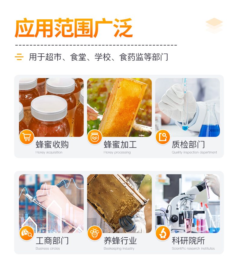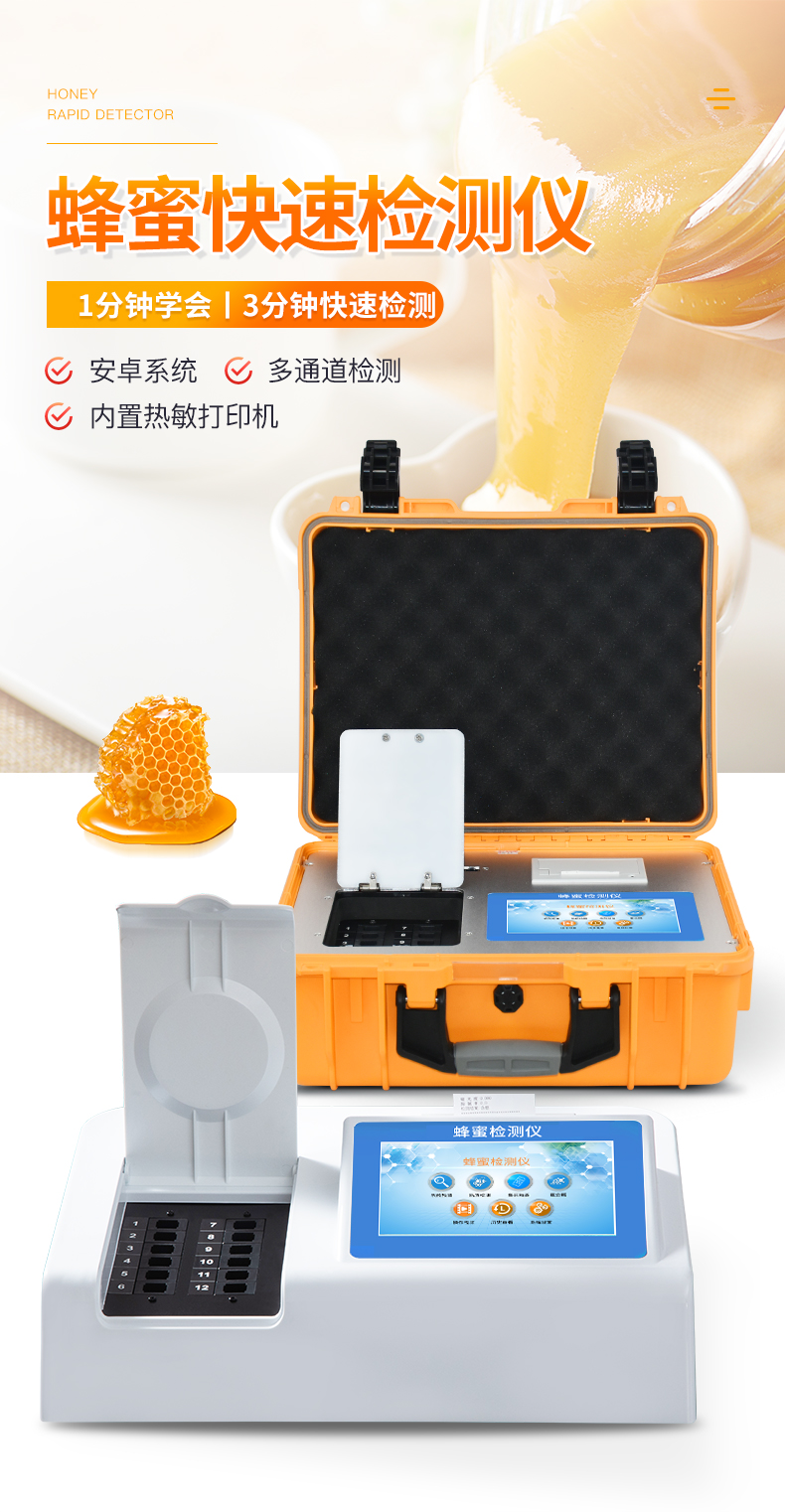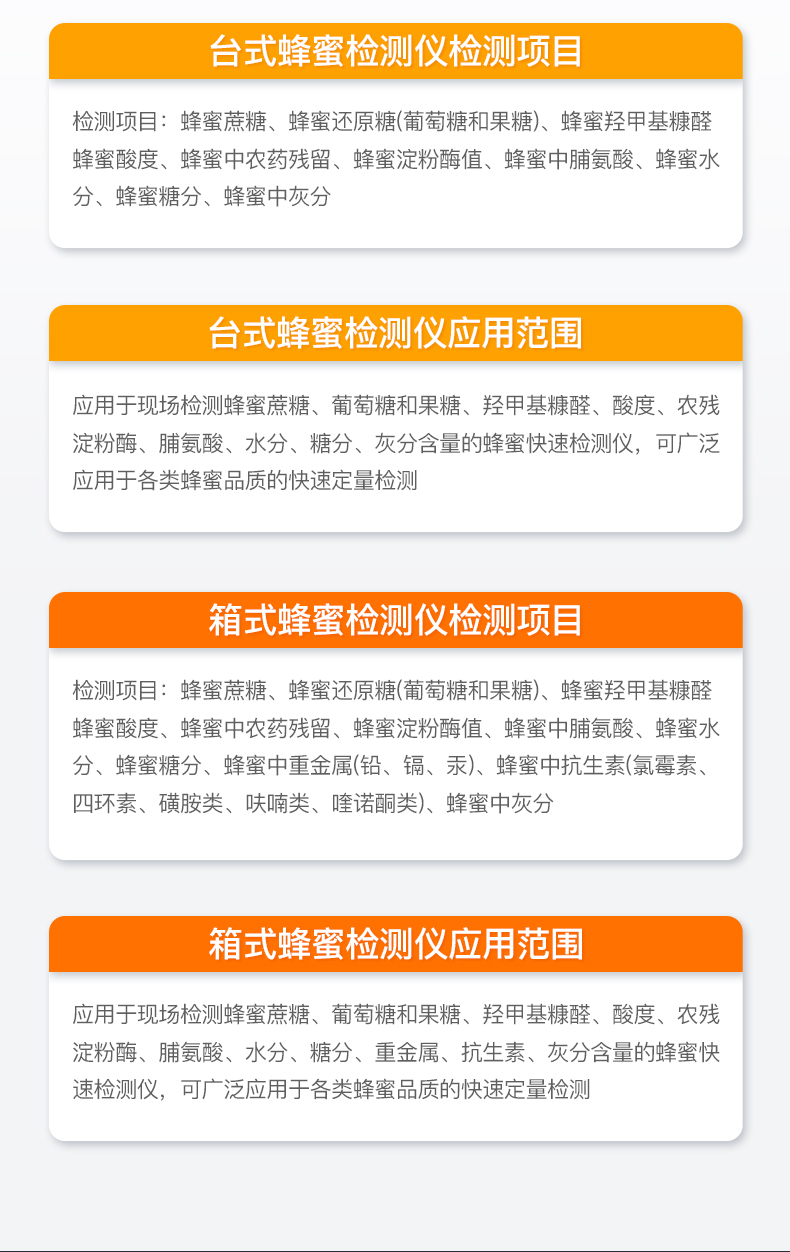 | 定量检测:蜂蜜蔗糖、蜂蜜还原糖(葡萄糖和果糖)、蜂蜜羟甲基糠醛、蜂蜜淀粉酶值、蜂蜜中脯氨酸、蜂蜜酸度、蜂蜜水分、蜂蜜糖分、蜂蜜中灰分。 | 定性检测:蜂蜜中农药残留、蜂蜜中重金属(铅、镉、汞)、蜂蜜中抗生素(氯霉素、四环素、磺胺类、呋喃类、喹诺酮类)。 |