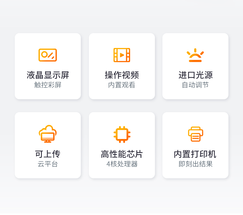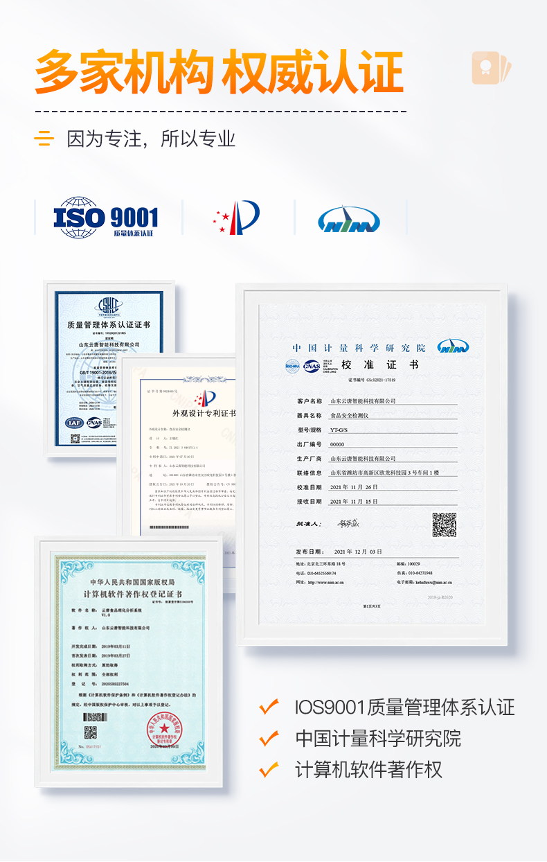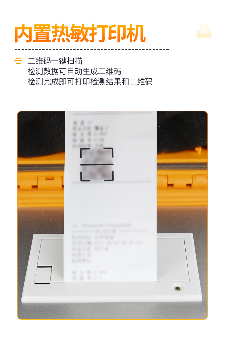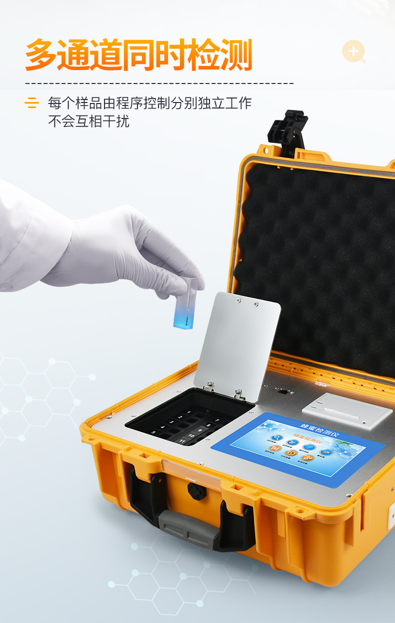 | ◆ 安卓智能操作系统,采用更加**UI交互界面,仪器具有wifi联网上传、4G联网传输、GPRS无线远传、网线连接功能,快速批量上传数据。 | 智能化程度高,仪器具有自检功能:具有开机自检和调零功能,具有自动检测重复性功能。 | ◆ 新一代高速热敏打印机,检测完成可自动打印或批量打印检测报告和二维码。 | ◆ 仪器带有监管平台,数据可局域网和互联网数据上传,检测结果直接传至食品安全监管平台。进行区域食品安全监管及大数据分析处理与数据统计,检测区域食品安全长短期动态,达到食品安全问题预估、预警 | ◆ 一体化主机,包含光电比色检测模块、胶体金免疫层析检测模块。 | ◆ 一体化便携式快检设备,满足现场及流动检测使用需求,能够在同一软件下实现所有检测项目的检测,并可通过同一窗口直观显示检测结果。 | 胶体金模块检测方式:轨道式自动传输扫描,检测完成后自动退出检测卡。 | ◆ CT线自动识别,无需手动调整。 | ◆ 仪器具有多品类多种类样品菜单库,可灵活选择检测样品,不同的检测通道可同时检测不同的样品项目。也可在仪器上直接编辑录入样品名称、检测指标、送检单位等信息并保存进样品数据库。 | ◆ 仪器内置操作视频,是您身边的化验指导专家。 | ◆ 样品处理简单省力,整体操作快速、安全、便捷。 | ◆ 仪器具有自身保护功能,可设置用户名及密码,防止非工作人员操作等。 | ◆ 高灵敏度,高检测精度,高重复性精度,扫描式高精度光学传感器。 | ◆ 仪器具有重新校准、锁定、恢复出厂设置功能。 | ◆ 结果判定线可修改,对照值标定值可保存,断电不丢失数据。 | ◆ 兼容市场上所有的胶体金卡,使用耗材不受限制,极大增强用户使用体验。 |