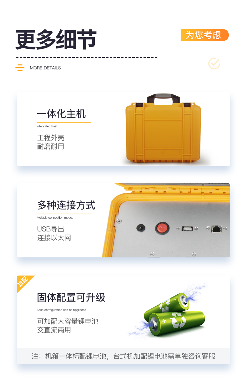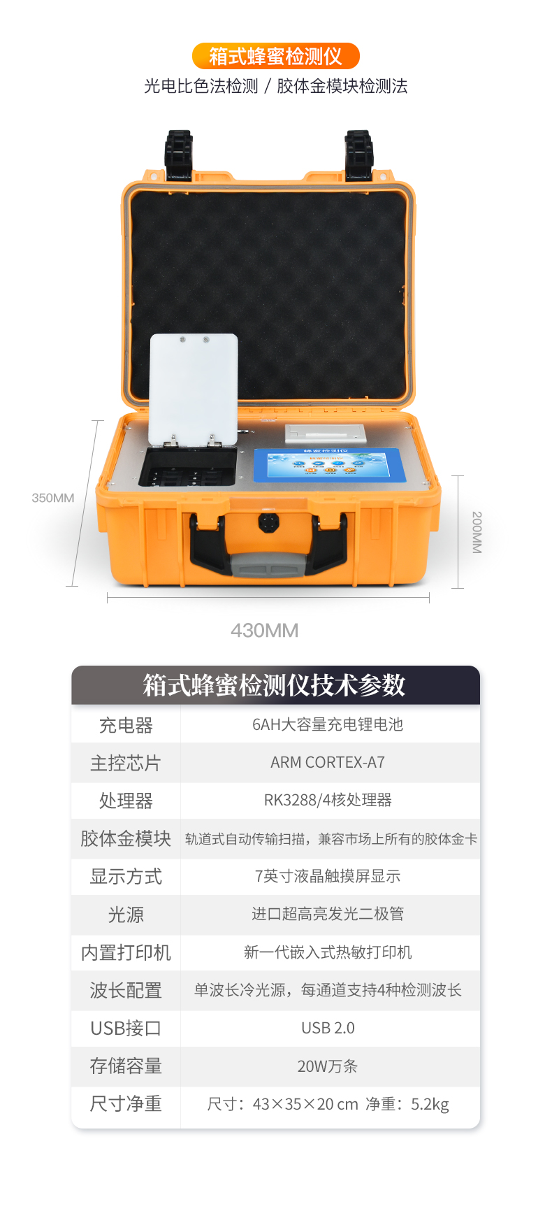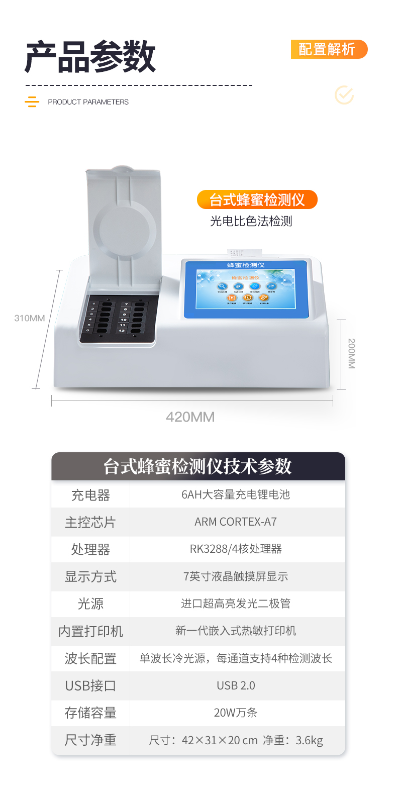 | ◆ 主控芯片采用ARM Cortex-A7,RK3288/4核处理器,主频1.88Ghz,运转速度更快速,稳定性更强。 | 显示方式:7英寸液晶触摸屏显示,人性化中文操作界面,读数直观、简单。 | ◆ 交直流两用,直流12V供电,也可连接车载电源,可加配6ah大容量充电锂电池,方便户外流动测试。 | ◆ 四波长冷光源,12个检测通道,每个通道均配置410、528、590、620nm波长光源,标配**的光路切换装置,专业光路切换功能可实现*多64波长,并且所有检测项目可实现所有通道同时检测。 | ◆ 光源亮度自动调节与校准 | ◆ 智能恒流稳压,光强自动校准,长时间连续工作光源无温漂现象。 | ◆ 内置新国家限量标准,与所测结果进行现场比对,并持续更新标准。 | ◆ 不间断进样,连续检测 | ◆ 样本编号自动累加。 | ◆ 检测结果为Excel表格,连接电脑即可拷贝。 | ◆ 检测结果存储容量20万条。 | ◆ 支持U盘存储,标准USB接口,免驱动安装。 | ◆ 检测项目可扩充,固件可升级。 | 仪器尺寸:430×350×200mm, 主机净重:5.2kg。 | 仪器包装尺寸:510*390*375mm,包装重量:9.3kg | 水浴锅包装尺寸:410*260*280mm,包装重量:5.25kg |