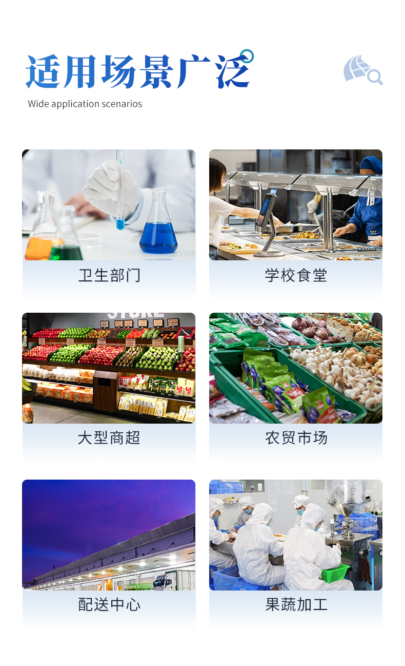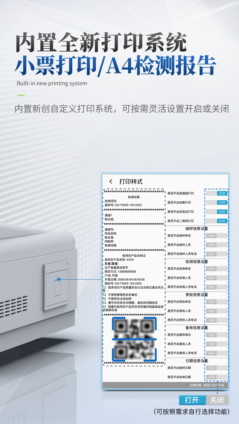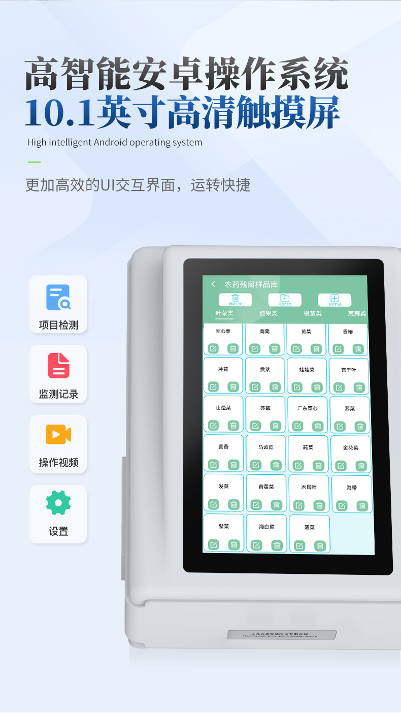 | ◆ 仪器采用台式一体化系统检测技术,将分光光度模块、数字化管理模块、无线通讯模块高度集成于一体,可支持检测60种食品安全检测项目,同时预留升级检测方法。 | ◆ 仪器检测模块标准化、智能化,检测项目可随意自由组合。检测箱体内置多个标准检测单元,检测模块可以调整配置。 | 显示屏幕:仪器采用10.1英寸竖向液晶触摸屏显,搭配运行安卓智能操作系统,主控芯片采用ARM Cortex-A7,RK3288/4核处理器,主频1.88Ghz,操作方便,性能更强。 | 检测通道:≥12通道;采用精密旋转比色池设计,使用同芯片同光源校准精度,解决不同光源之间的误差值,1-12通道间误差0.1%,更加准确**。(***:**202022821055.2) | 仪器光源:高精度进口四波长冷光源,每个通道均配置 410、520、590、630nm 波长光源,标配**的光路切换装置,专利光路切换功能可实现64波长,并且所有检测项目可实现所有通道同时检测。 | ◆ 设备可一键校准,自动保存校准数据,自动对比校验,得到精准光源,采用数据库+SP+文件三种方式存储数据,光源数据永不丢失,方便每一次使用。 | 通讯接口:配备无线通信模块、4G(APN)通讯模块、蓝牙传输,同时具有双USB接口以及RJ45网线接口,可以多方式实现数据保存及数据传输。 | 存储方式:支持U盘存储,标准USB接口,免驱动安装。检测结果存储容量20万条以上,可生成Excel表格进行拷贝,并具有登录保护功能。 | ◆ 智能化操作系统: | 1、操作系统:仪器可在同一检测界面自动对应相关检测通道,一次性选择1-12个样品名称,无需退出界面,节省操作时间。并可以对每个通道属性和样品信息单独进行编辑,例如送检单位、人员,检测人员等,打印时勾选打印显示。 | 2、数据集成系统:设备首页自动汇总分析检测数据,包含:周检测数据、月检测数据,全部检测总数量,均包含检测总数,合格数,不合格数,以及相关柱形分析图,各项检测数据一目了然,无需电脑查询,更加快捷直观。 | 3、数据库系统:十几项数据库分类管理仪器:包含项目类型、项目数据、检测数据、历史记录、国标信息、曲线信息、采样信息、检测信息、受检信息、复核信息、图表信息、光源校准信息、打印样式信息、样品库信息等等,数据库之间互相协调联动保证数据的真实完整性。同时产品数据库以及历史检测记录支持一键检索功能。 | 4、限量规判系统:具有限量查询、添加物质合规判定系统。检测出结果后,系统自动调用系统数据库中相关国标进行比对判定,客观显示判定结果是否合格。 | 5、项目预设系统:仪器具有任务预设模块,一键提前预设,给出方便快捷的新检测方案,每一个任务分别可以设置不同的样品、批次、编号、来源、备注、抽样信息、检测信息、受检信息、复核信息等更多信息。样品送检时一键调取保存信息,并可多次调取,大大提高检测效率。 | 6、数据监管系统:同步对接监管平台,数据可局域网和互联网数据上传,检测结果可选择直接传至食品安全监管平台。进行区域食品安全监管及大数据分析处理与数据统计,检测区域食品安全长短期动态,达到食品安全问题预估、预警。 | 7.1、全新打印系统:内置全新打印机,新创自定义打印方式,可按需灵活勾选控制:二维码,抽样信息、检测信息,受检信息、复核信息、抽样日期、检测日期等信息的打印。 | 7.2、A4纸版本报告打印功能:设备拥有两种结果展示方式,可以自动生成A4打印模板和小票打印模板两种样式,可通过WiFi及网线等方式链接外置打印机可进行打印。 | 供电模式:仪器交直流两用,直流12V供电,可连接车载电源,可配6ah大容量充电锂电池,电量可实时显示,方便户外流动测试。 | ◆ 仪器具备远程升级功能,可定向分客户分仪器更新,开机后自动更新,并可持续性免费更新系统版本,无需像传统产品返厂更新,节省时间及人力成本并避免了物流运输返厂升级导致设备损坏的潜在风险。 |