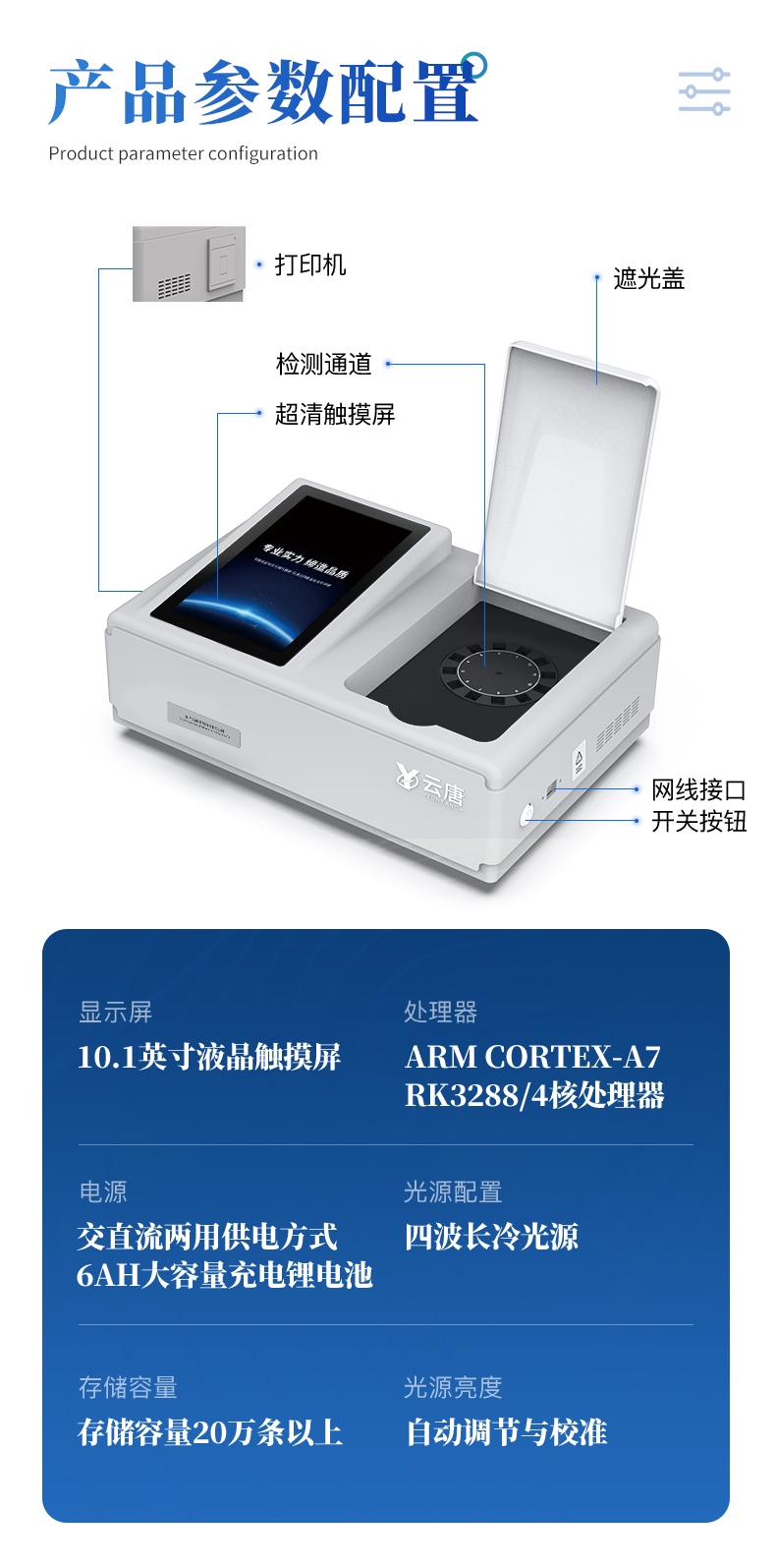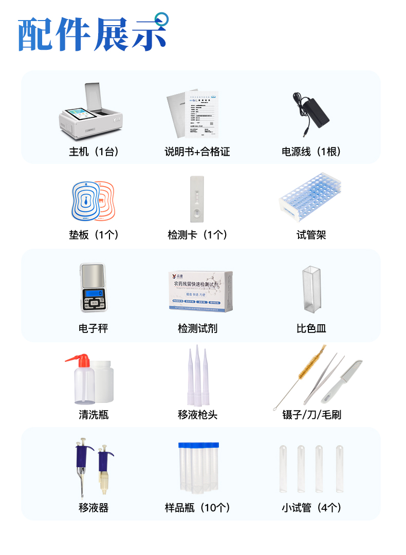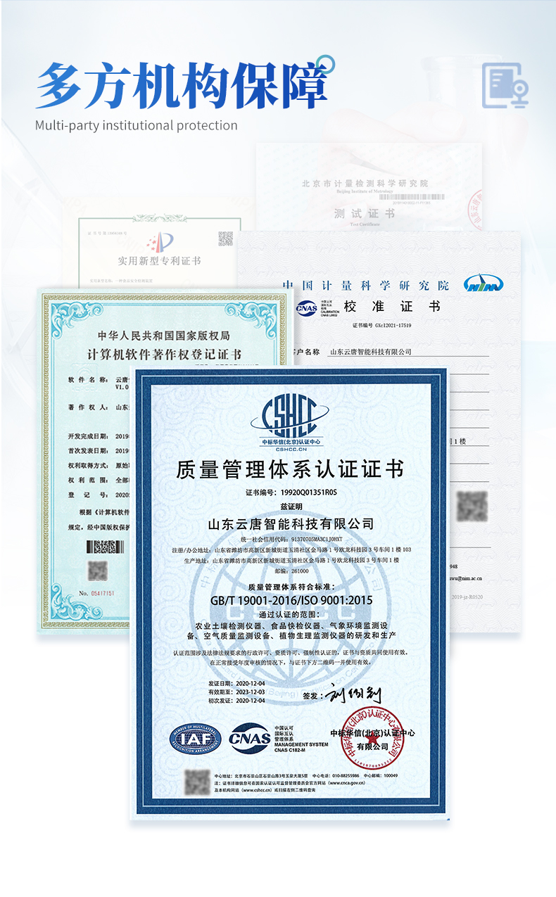 | ◆ 仪器采用台式一体化系统检测技术,将分光光度模块、数字化管理模块、无线通讯模块高度集成于一体,可支持检测60种食品安全检测项目,同时预留升级检测方法。 | ◆ 仪器检测模块标准化、智能化,检测项目可随意自由组合。检测箱体内置多个标准检测单元,检测模块可以调整配置。 | 显示屏幕:仪器采用10.1英寸竖向液晶触摸屏显,搭配运行安卓智能操作系统,主控芯片采用ARM Cortex-A7,RK3288/4核处理器,主频1.88Ghz,操作方便,性能更强。 | 检测通道:≥12通道;采用精密旋转比色池设计,使用同芯片同光源校准精度,解决不同光源之间的误差值,1-12通道间误差0.1%,更加准确**。(***:**202022821055.2) | 仪器光源:高精度进口四波长冷光源,每个通道均配置 410、520、590、630nm 波长光源,标配**的光路切换装置,专利光路切换功能可实现64波长,并且所有检测项目可实现所有通道同时检测。 | ◆ 设备可一键校准,自动保存校准数据,自动对比校验,得到精准光源,采用数据库+SP+文件三种方式存储数据,光源数据永不丢失,方便每一次使用。 | 通讯接口:配备无线通信模块、4G(APN)通讯模块、蓝牙传输,同时具有双USB接口以及RJ45网线接口,可以多方式实现数据保存及数据传输。 | 存储方式:支持U盘存储,标准USB接口,免驱动安装。检测结果存储容量20万条以上,可生成Excel表格进行拷贝,并具有登录保护功能。 | ◆ 智能化操作系统: | 1、操作系统:仪器可在同一检测界面自动对应相关检测通道,一次性选择1-12个样品名称,无需退出界面,节省操作时间。并可以对每个通道属性和样品信息单独进行编辑,例如送检单位、人员,检测人员等,打印时勾选打印显示。 | 2、数据集成系统:设备首页自动汇总分析检测数据,包含:周检测数据、月检测数据,全部检测总数量,均包含检测总数,合格数,不合格数,以及相关柱形分析图,各项检测数据一目了然,无需电脑查询,更加快捷直观。 | 3、数据库系统:十几项数据库分类管理仪器:包含项目类型、项目数据、检测数据、历史记录、国标信息、曲线信息、采样信息、检测信息、受检信息、复核信息、图表信息、光源校准信息、打印样式信息、样品库信息等等,数据库之间互相协调联动保证数据的真实完整性。同时产品数据库以及历史检测记录支持一键检索功能。 | 4、限量规判系统:具有限量查询、添加物质合规判定系统。检测出结果后,系统自动调用系统数据库中相关国标进行比对判定,客观显示判定结果是否合格。 | 5、项目预设系统:仪器具有任务预设模块,一键提前预设,给出方便快捷的新检测方案,每一个任务分别可以设置不同的样品、批次、编号、来源、备注、抽样信息、检测信息、受检信息、复核信息等更多信息。样品送检时一键调取保存信息,并可多次调取,大大提高检测效率。 | 6、数据监管系统:同步对接监管平台,数据可局域网和互联网数据上传,检测结果可选择直接传至食品安全监管平台。进行区域食品安全监管及大数据分析处理与数据统计,检测区域食品安全长短期动态,达到食品安全问题预估、预警。 | 7.1、全新打印系统:内置全新打印机,新创自定义打印方式,可按需灵活勾选控制:二维码,抽样信息、检测信息,受检信息、复核信息、抽样日期、检测日期等信息的打印。 | 7.2、A4纸版本报告打印功能:设备拥有两种结果展示方式,可以自动生成A4打印模板和小票打印模板两种样式,可通过WiFi及网线等方式链接外置打印机可进行打印。 | 供电模式:仪器交直流两用,直流12V供电,可连接车载电源,可配6ah大容量充电锂电池,电量可实时显示,方便户外流动测试。 | ◆ 仪器具备远程升级功能,可定向分客户分仪器更新,开机后自动更新,并可持续性免费更新系统版本,无需像传统产品返厂更新,节省时间及人力成本并避免了物流运输返厂升级导致设备损坏的潜在风险。 |