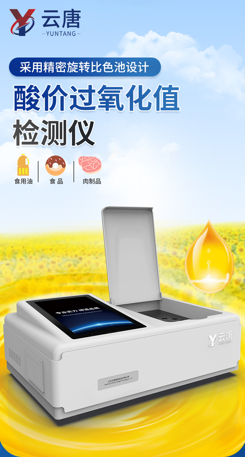 山东云唐智能科技有限公司生产的过氧化值检测仪为集成化食品安全快速检测分析设备,采用台式一体化设计,能够快速检测食用植物油、食用猪油、花生油、葵花油、米糠油、食品、肉制品中的过氧化值含量;仪器预留其他项目检测程序和端口,根据日后需求可进行远程升级