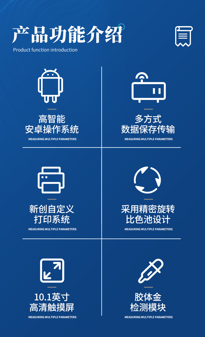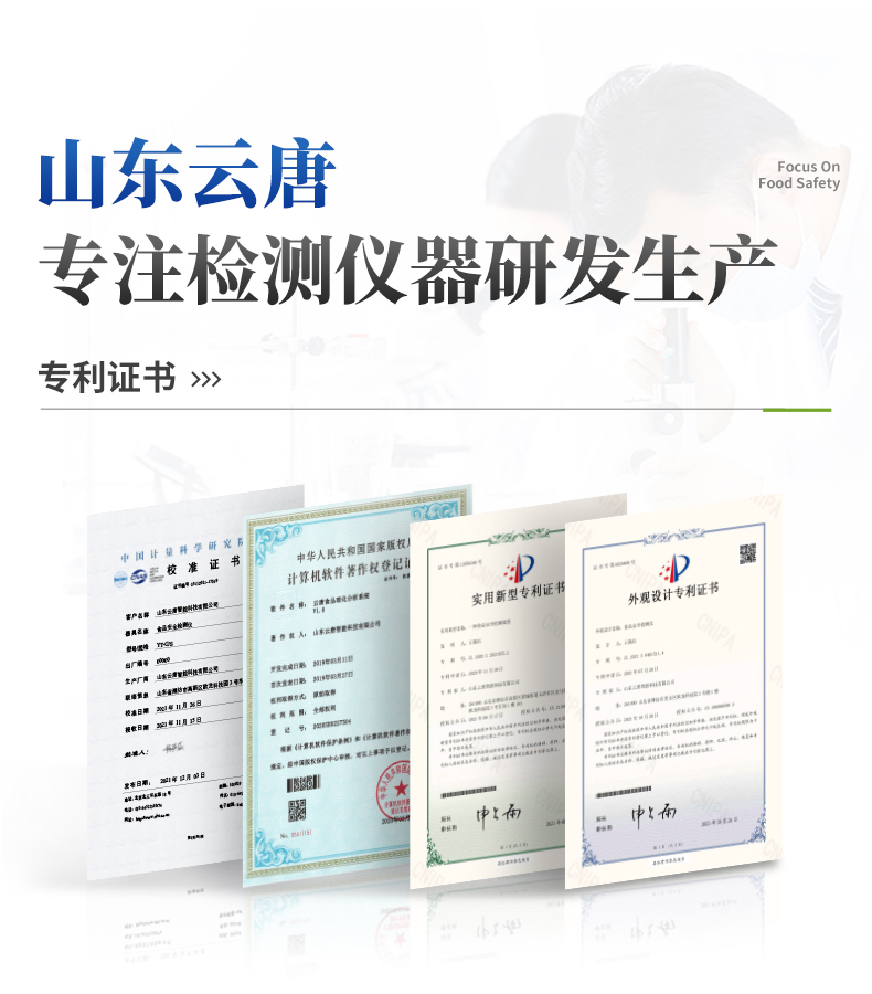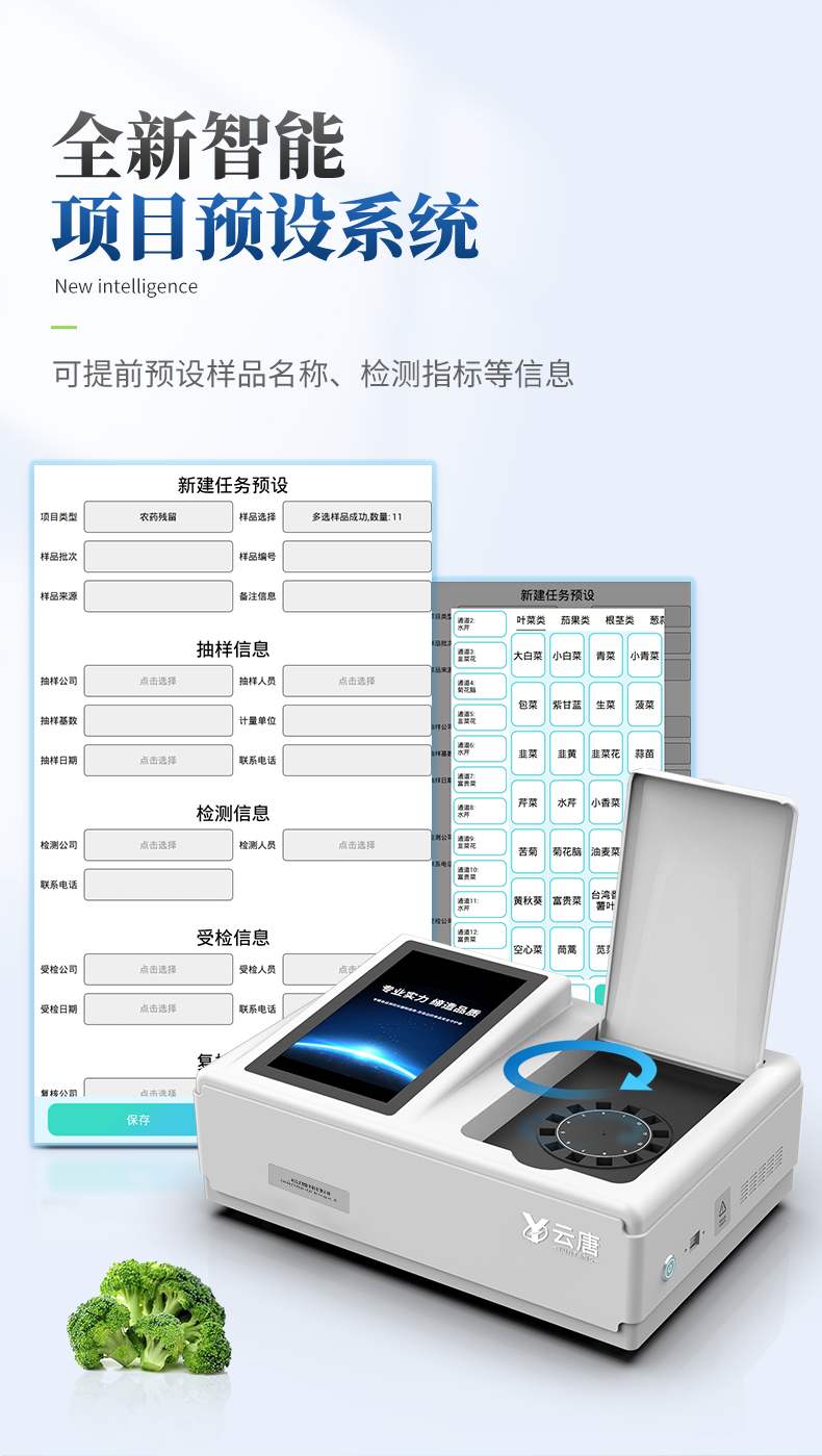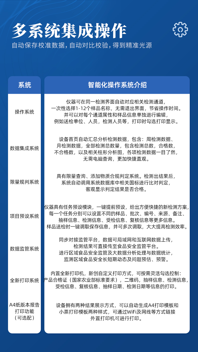 | ◆ 仪器采用台式一体化系统检测技术,将分光光度模块、数字化管理模块、无线通讯模块高度集成于一体,可支持检测60种食品安全检测项目,同时预留升级检测方法。 | 显示屏幕:仪器采用10.1英寸竖向液晶触摸屏显,搭配运行安卓智能操作系统,主控芯片采用ARM Cortex-A7,RK3288/4核处理器,主频1.88Ghz,操作方便,性能更强。 | 检测通道:≥12通道;采用精密旋转比色池设计,使用同芯片同光源校准精度,解决不同光源之间的误差值,1-12通道间误差0.1%,更加准确**。(***:**202022821055.2) | 仪器光源:高精度进口四波长冷光源,每个通道均配置 410、520、590、630nm 波长光源,标配**的光路切换装置,专利光路切换功能可实现64波长,并且所有检测项目可实现所有通道同时检测。 | ◆ 设备可一键校准,自动保存校准数据,自动对比校验,得到精准光源,采用数据库+SP+文件三种方式存储数据,光源数据永不丢失,方便每一次使用。 | 通讯接口:配备无线通信模块、4G(APN)通讯模块、蓝牙传输,同时具有双USB接口以及RJ45网线接口,可以多方式实现数据保存及数据传输。 | 存储方式:支持U盘存储,标准USB接口,免驱动安装。检测结果存储容量20万条以上,可生成Excel表格进行拷贝,并具有登录保护功能。 | ◆ 智能化操作系统: | 1、操作系统:仪器可在同一检测界面自动对应相关检测通道,一次性选择1-12个样品名称,无需退出界面,节省操作时间。并可以对每个通道属性和样品信息单独进行编辑,例如送检单位、人员,检测人员等,打印时勾选打印显示。 | 2、数据集成系统:设备首页自动汇总分析检测数据,包含:周检测数据、月检测数据,全部检测总数量,均包含检测总数,合格数,不合格数,以及相关柱形分析图,各项检测数据一目了然,无需电脑查询,更加快捷直观。 | 3、数据库系统:十几项数据库分类管理仪器:包含项目类型、项目数据、检测数据、历史记录、国标信息、曲线信息、采样信息、检测信息、受检信息、复核信息、图表信息、光源校准信息、打印样式信息、样品库信息等等,数据库之间互相协调联动保证数据的真实完整性。同时产品数据库以及历史检测记录支持一键检索功能。 | 4、限量规判系统:具有限量查询、添加物质合规判定系统。检测出结果后,系统自动调用系统数据库中相关国标进行比对判定,客观显示判定结果是否合格。 | 5、项目预设系统:仪器具有任务预设模块,一键提前预设,给出方便快捷的新检测方案,每一个任务分别可以设置不同的样品、批次、编号、来源、备注、抽样信息、检测信息、受检信息、复核信息等更多信息。样品送检时一键调取保存信息,并可多次调取,大大提高检测效率。 | 6、数据监管系统:同步对接监管平台,数据可局域网和互联网数据上传,检测结果可选择直接传至食品安全监管平台。进行区域食品安全监管及大数据分析处理与数据统计,检测区域食品安全长短期动态,达到食品安全问题预估、预警。 | 7.1、全新打印系统:内置全新打印机,新创自定义打印方式,可按需灵活勾选控制:二维码,抽样信息、检测信息,受检信息、复核信息、抽样日期、检测日期等信息的打印。 | 7.2、A4纸版本报告打印功能:设备拥有两种结果展示方式,可以自动生成A4打印模板和小票打印模板两种样式,可通过WiFi及网线等方式链接外置打印机可进行打印。 | 供电模式:仪器交直流两用,直流12V供电,可连接车载电源,可配6ah大容量充电锂电池,电量可实时显示,方便户外流动测试。 | ◆ 仪器具备远程升级功能,可定向分客户分仪器更新,开机后自动更新,并可持续性免费更新系统版本,无需像传统产品返厂更新,节省时间及人力成本并避免了物流运输返厂升级导致设备损坏的潜在风险。 |