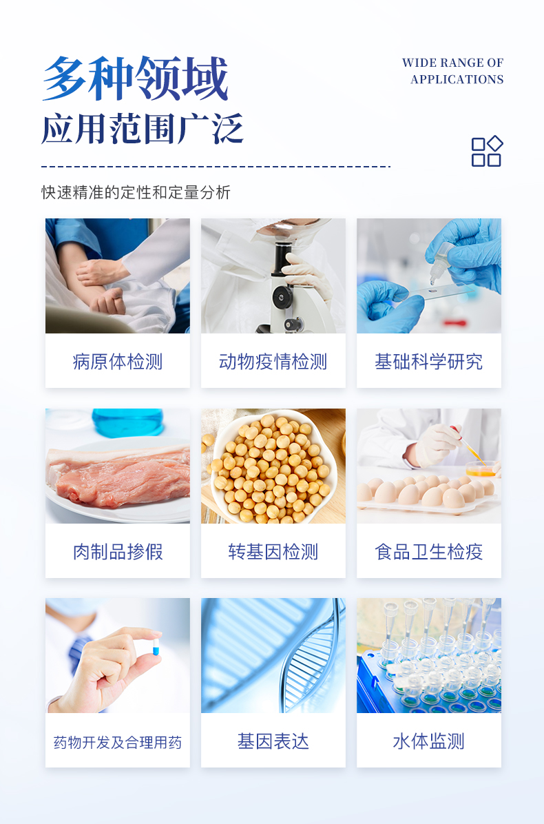 对取于其他动物体内的生物样本(如血液,体液等)中包含的目标核酸,进行快速精准的定性和定量分析,同时也能够对特殊样本进行标准曲线,熔解曲线,基因分型等分析。
