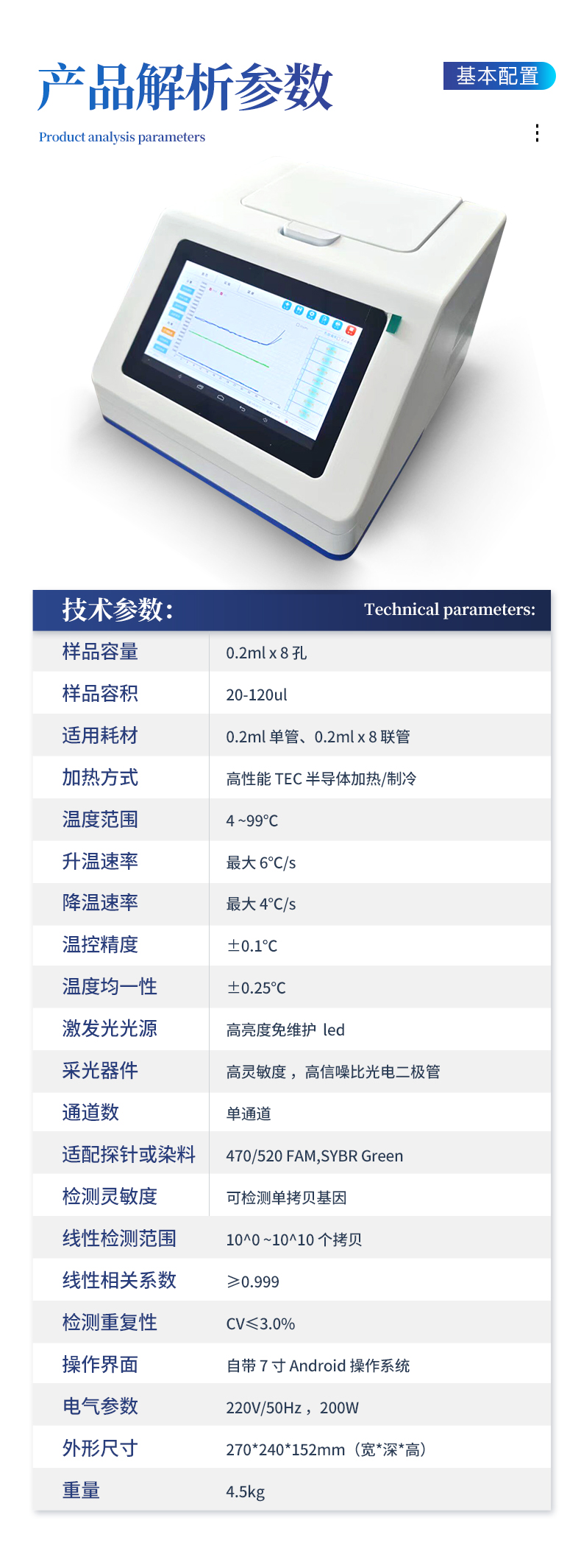 | 样品容量:8x0.2ml、支持8联管 | 适用耗材:常见透明PCR 耗材,8x0.2ml 排管,0.2ml 单管 | 反应体系:5-120ul反应模式体系 | 加热/制冷模块:进口半导体热电模块 | 温度控制范围:4°C-99℃ | 升降温平均速率≥2°C/秒 | 温控精度:≤±0.1°C | 温度均匀性:≤± 0.2°C | 温控区域数量:多点(2 点) | 梯度数:0 个 | 梯度温度范围:无 | 梯度孔数:无 | 激发光源:免维护led | 激发光波长范围:400-700nm | 检测部件:进口光电检测器 | 检测通道数:标配 1通道(FAM)、高配(选配)(FAM、VIC) | 适用染料和探针:FAM/SYBR Green I, VIC/HEX/CY3(选配), ROX/Texas Red(选配), Cy5,TAMARA(选配) | 软件功能:荧光定量 PCR 系统软件;实时扩增反应曲线功能;特定标本实时反应曲线显示;数据分析功能;阴阳结果自动判定功能;图形化显示功能。 | 噪音:<45 dB | 屏幕尺寸:7 英寸(HD) | 触摸屏:电容式 | 外接USB:支持数据导入导出 | 热盖:自动压力调节 | 外观尺寸:290(W)*308(L)*130(H) | 箱子尺寸:75长*38宽*19高cm | 净重:约3Kg |