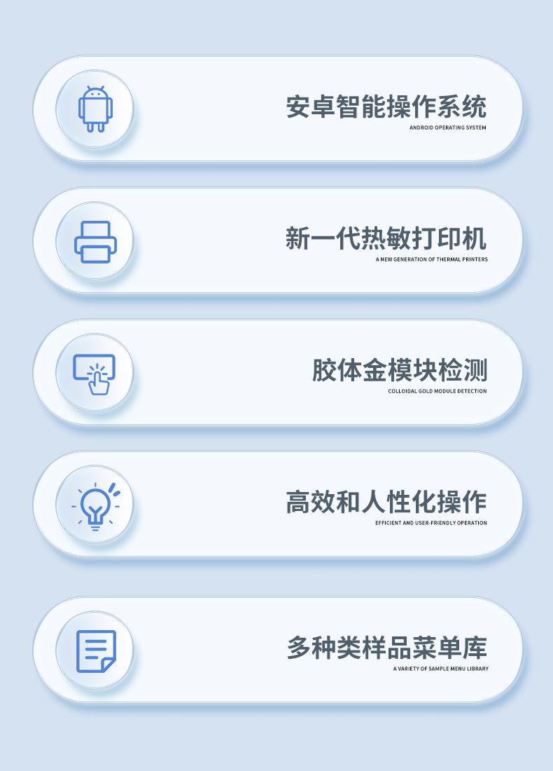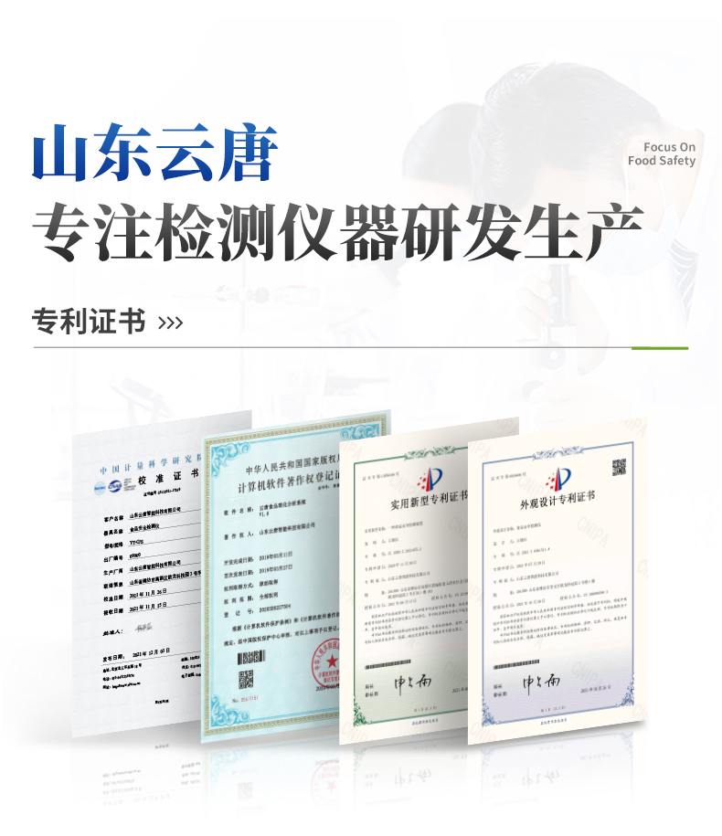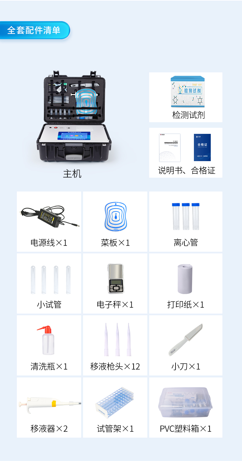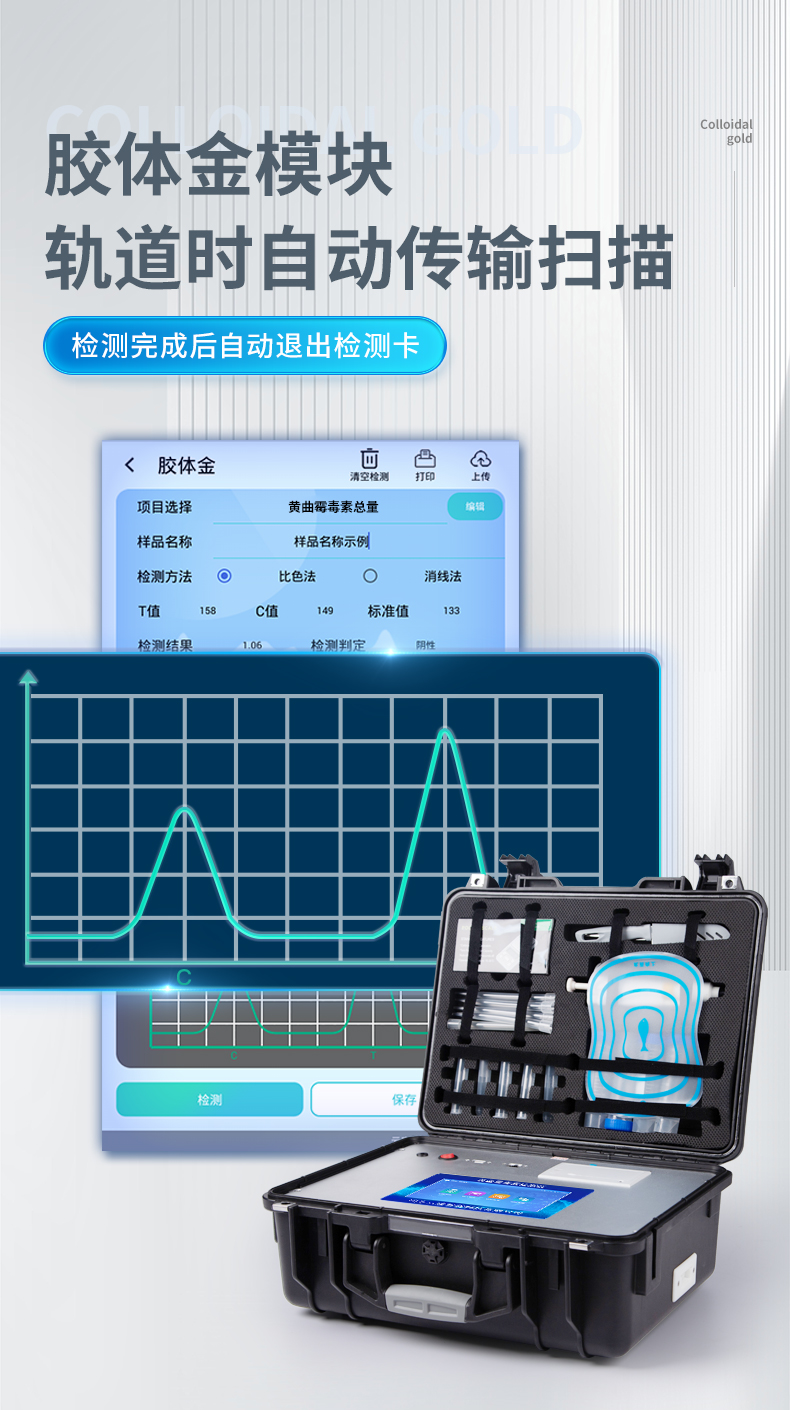| ◆ 安卓智能操作系统,采用更加**和人性化操作,仪器具有网线连接、wifi联网上传、GPRS无线远传功能,快速上传数据。 | 智能化程度高,仪器具有自检功能:具有开机自检和调零功能,具有自动检测重复性功能。 | ◆ 新一代高速热敏打印机,检测完成可自动打印检测报告和二维码。 | ◆ 仪器带有监管平台,数据可局域网和互联网数据上传,检测结果直接传至食品安全监管平台。进行区域食品安全监管及大数据分析处理与数据统计,检测区域食品安全长短期动态,达到食品安全问题预估、预警 | ◆ 一体化主机,包含食品安全检测模块、多通道农药残留检测模块、胶体金免疫层析检测模块。 | ◆ 一体化便携式快检设备,满足现场及流动检测使用需求,能够在同一软件下实现所有检测项目的检测,并可通过同一窗口直观显示检测结果。 | 胶体金模块检测方式:轨道式自动传输扫描,检测完成后自动退出检测卡。 | ◆ CT线自动识别,无需手动调整。 | ◆ 仪器具有品类多种类样品菜单库,可灵活选择检测样品,不同的检测通道可同时检测不同的样品项目。 | ◆ 样品处理简单省力,整体操作快速、安全、便捷。 | ◆ 仪器具有自身保护功能,可设置用户名及密码,防止非工作人员操作等。 | ◆ 高灵敏度,高检测精度,高重复性精度,扫描式高精度光学传感器。 | ◆ 内置强大的数据库,可在仪器上直接选择样品名称、检测指标、送检单位等信息,也可在仪器上直接编辑录入样品名称、检测指标、送检单位等信息并保存进样品数据库。 | ◆ 仪器具有重新校准、锁定、恢复出厂设置功能。 | ◆ 结果判定线可修改,对照值标定值可保存,断电不丢失数据。 | ◆ 兼容市场上所有的胶体金卡,使用耗材不受限制,极大增强用户使用体验。 |