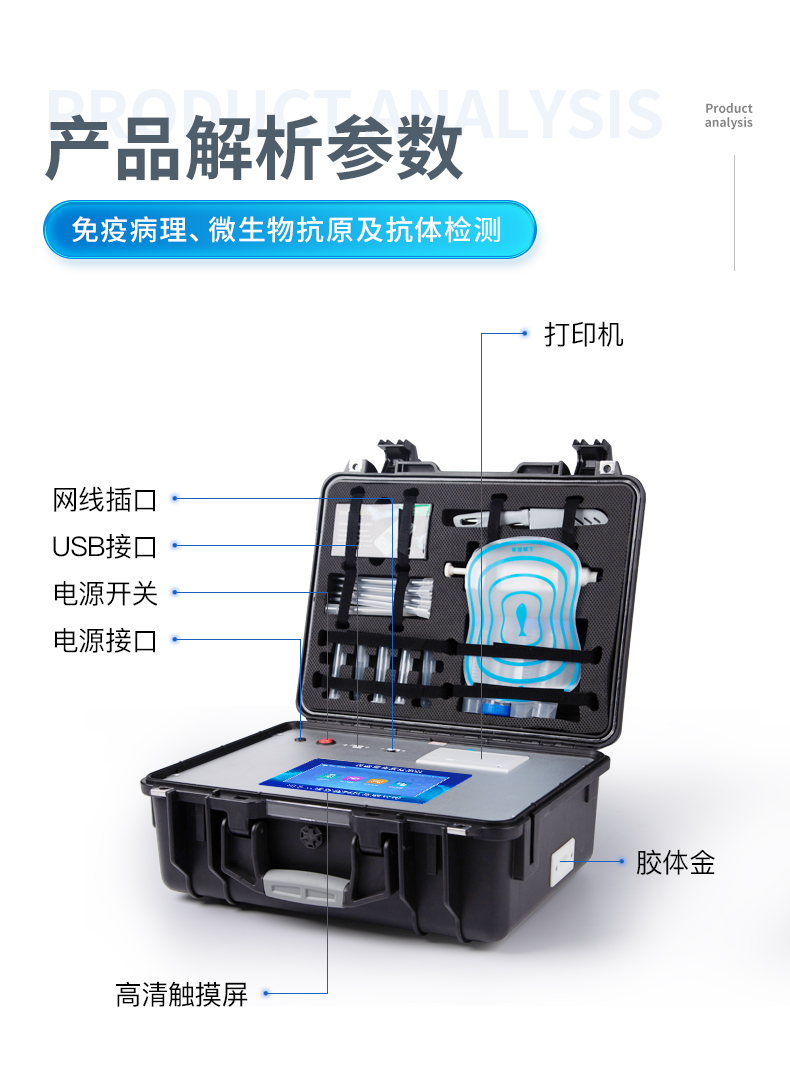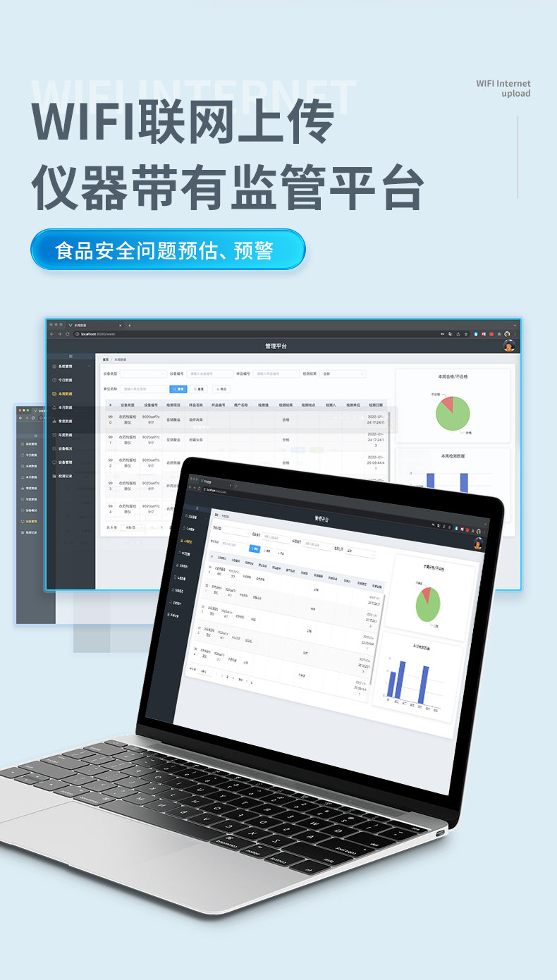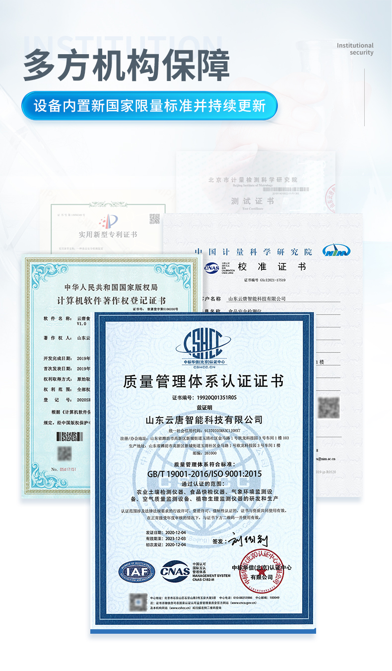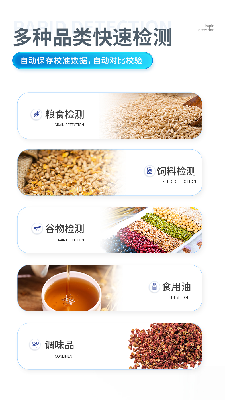 | ◆ 安卓智能操作系统,采用更加**和人性化操作,仪器具有网线连接、wifi联网上传、GPRS无线远传功能,快速上传数据。 | 智能化程度高,仪器具有自检功能:具有开机自检和调零功能,具有自动检测重复性功能。 | ◆ 新一代高速热敏打印机,检测完成可自动打印检测报告和二维码。 | ◆ 仪器带有监管平台,数据可局域网和互联网数据上传,检测结果直接传至食品安全监管平台。进行区域食品安全监管及大数据分析处理与数据统计,检测区域食品安全长短期动态,达到食品安全问题预估、预警 | ◆ 一体化主机,包含食品安全检测模块、多通道农药残留检测模块、胶体金免疫层析检测模块。 | ◆ 一体化便携式快检设备,满足现场及流动检测使用需求,能够在同一软件下实现所有检测项目的检测,并可通过同一窗口直观显示检测结果。 | 胶体金模块检测方式:轨道式自动传输扫描,检测完成后自动退出检测卡。 | ◆ CT线自动识别,无需手动调整。 | ◆ 仪器具有品类多种类样品菜单库,可灵活选择检测样品,不同的检测通道可同时检测不同的样品项目。 | ◆ 样品处理简单省力,整体操作快速、安全、便捷。 | ◆ 仪器具有自身保护功能,可设置用户名及密码,防止非工作人员操作等。 | ◆ 高灵敏度,高检测精度,高重复性精度,扫描式高精度光学传感器。 | ◆ 内置强大的数据库,可在仪器上直接选择样品名称、检测指标、送检单位等信息,也可在仪器上直接编辑录入样品名称、检测指标、送检单位等信息并保存进样品数据库。 | ◆ 仪器具有重新校准、锁定、恢复出厂设置功能。 | ◆ 结果判定线可修改,对照值标定值可保存,断电不丢失数据。 | ◆ 兼容市场上所有的胶体金卡,使用耗材不受限制,极大增强用户使用体验。 |