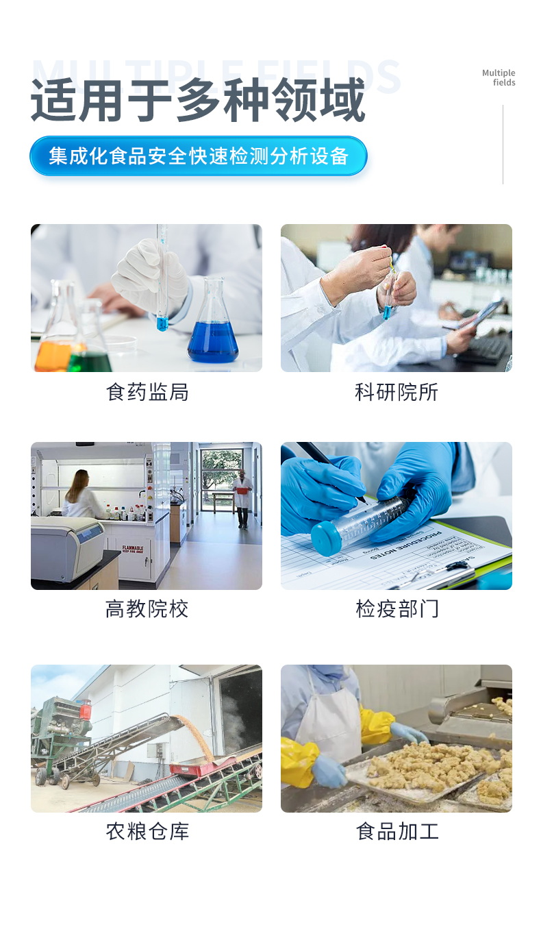 | ◆ 该仪器广泛应用于食药监局、卫生监督部门、农业部门、检验检疫部门、食品生产企业等单位部门对食品中的不安全指标进行监测使用。 |