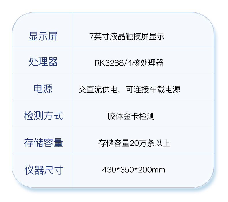 | ◆ 主控芯片采用ARM Cortex-A7,RK3288/4核处理器,主频1.88Ghz,运转速度更快速,稳定性更强。 | 显示方式:7英寸液晶触摸屏显示,人性化中文操作界面,读数直观、简单。 | ◆ 交直流两用,直流12V供电,可连接车载电源,可配6ah大容量充电锂电池,方便户外流动测试。 | ◆ 光源亮度自动调节与校准 | ◆ 智能恒流稳压,光强自动校准,长时间连续工作光源无温漂现象。。 | ◆ 内置新国家限量标准,与所测结果进行现场比对,并持续更新标准。 | ◆ 不间断进样,连续检测 | ◆ 样本编号自动累加。 | ◆ 检测项目可扩充。 | ◆ 检测结果可批量打印,批量上传。 | ◆ 检测结果为Excel表格,连接电脑即可拷贝。 | ◆ 检测结果存储容量20万条 | ◆ 支持U盘存储,标准USB接口,免驱动安装。 | ◆ 固件可升级 |