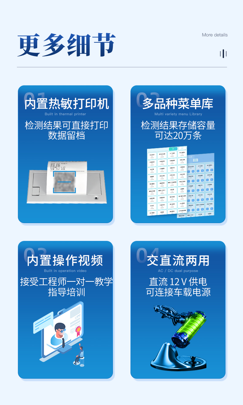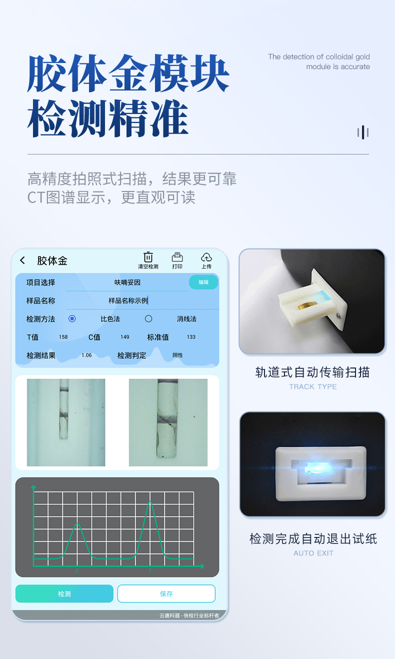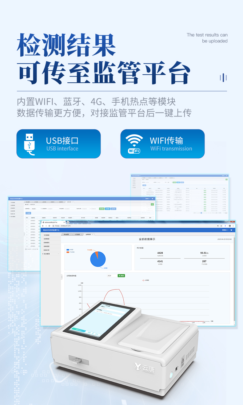 | ◆ 仪器采用10.1英寸液晶触摸屏显,搭配运行安卓智能操作系统,主控芯片采用ARM Cortex-A7,RK3288/4核处理器,主频1.88Ghz,运转速度更快速,性能更强。 | 仪器功能包括:胶体金检测模块、数字化管理模块、无线通讯模块等,可以满足同一软件下实现所有检测项目的检测,并在同一窗口展示检测结果。 | ◆ 一体化便携式快检设备,采用交直流两用供电方式,可连接车载电源,配备6ah大容量充电锂电池,可以满足现场及流动检测使用的需求。仪器尺寸:43×35×20cm, 主机净重:5.1kg | ◆ 系统自带数据集成模块,设备首页自动统计检测数据包含:周检测数据、月检测数据,全部检测总数量,均包含检测总数,合格数,不合格数,以及相关柱形分析图,对各项检测数据清晰掌握,无需电脑查询,更加快捷直观。 | ◆ 仪器具有任务预设模块,可在样品送检前提前预设样品名称、检测指标、送检单位等信息,样品送检时一键调取保存信息,检测更加方便快捷。 | ◆ 胶体金检测模块: | ◆ 轨道式自动传输扫描方式,可实时显示金标卡实时图像,系统自动分析并呈现出CT曲线图,CT线自动识别,无需手动调整,完成检测后自动退出检测卡。 | ◆ 结果判定线可修改,对照值标定值可保存,断电不丢失数据。 | ◆ 兼容市场上其他胶体金卡,使用耗材不受限制,极大增强用户使用体验。 | 图像调整功能:可根据金标卡读取图像进行多方位调整,使其更精准读取结果。 | ◆ 仪器检测系统拥有庞大数据库,并且构建了完善的检索、修订功能。食品库涵盖多种样品名称,可按需添加或删除、编辑样品名称;产品数据库以及历史检测记录支持一键检索功能。 | ◆ 系统打印自定义化,打印格式多样化,产品合格证(国家标准要求),二维码,抽样信息、检测信息,受检信息、复核信息、抽样日期、检测日期等信息结果,可按需求自行设置打印内容。 | A4纸版本报告打印功能:设备拥有两种结果展示方式,可以自动生成A4打印模板和小票打印模板两种样式,可通过WiFi及网线等方式链接外置打印机可进行打印 | ◆ 仪器具有 wifi 联网上传、RJ45网线连接功能,可以快速上传数据。同步对接监管平台,数据可局域网和互联网数据上传,检测结果直接传至食品安全监管平台。进行区域食品安全监管及大数据分析处理与数据统计,检测区域食品安全长短期动态,达到食品安全问题预估、预警。 | ◆ 设备支持U盘存储,标准USB接口,免驱动安装。检测结果存储容量20万条以上,可生成Excel表格,进行一键拷贝,并具有登录保护功能,可设置用户名及密码,规范不同人员操作权限,防止非工作人员操作,并且可以进行重新校准、锁定、恢复出厂设置功能。仪器固件可升级,后期检测项目可扩充。 | ◆ 仪器具备远程升级功能,可定向分客户分仪器更新,开机后自动更新,并可持续性免费更新系统版本,无需像传统产品返厂更新,节省时间及人力成本并避免了物流运输返厂升级导致设备损坏的潜在风险。 |