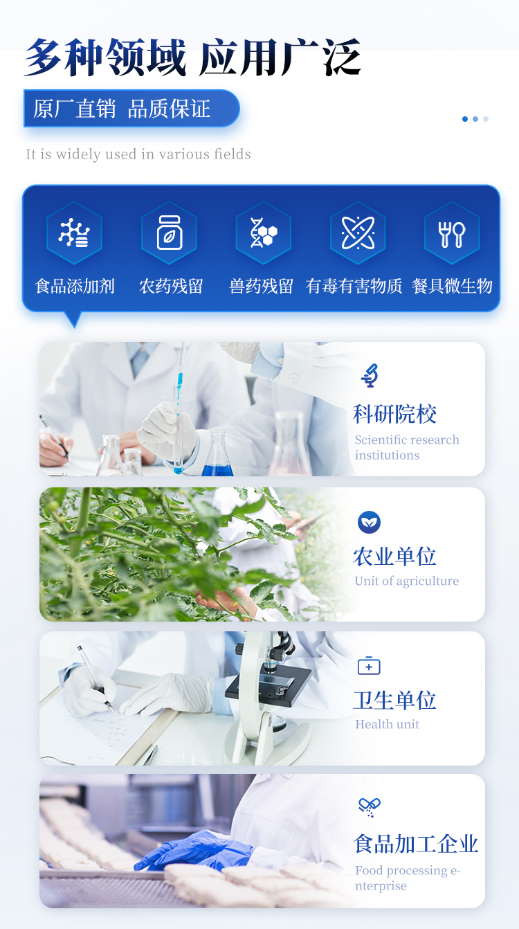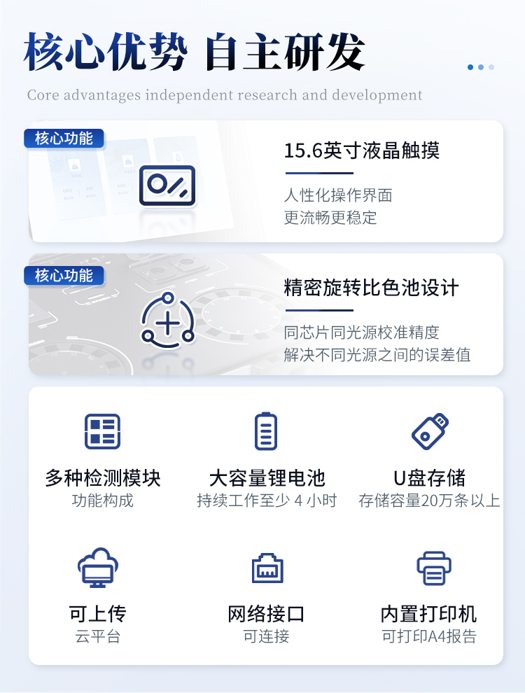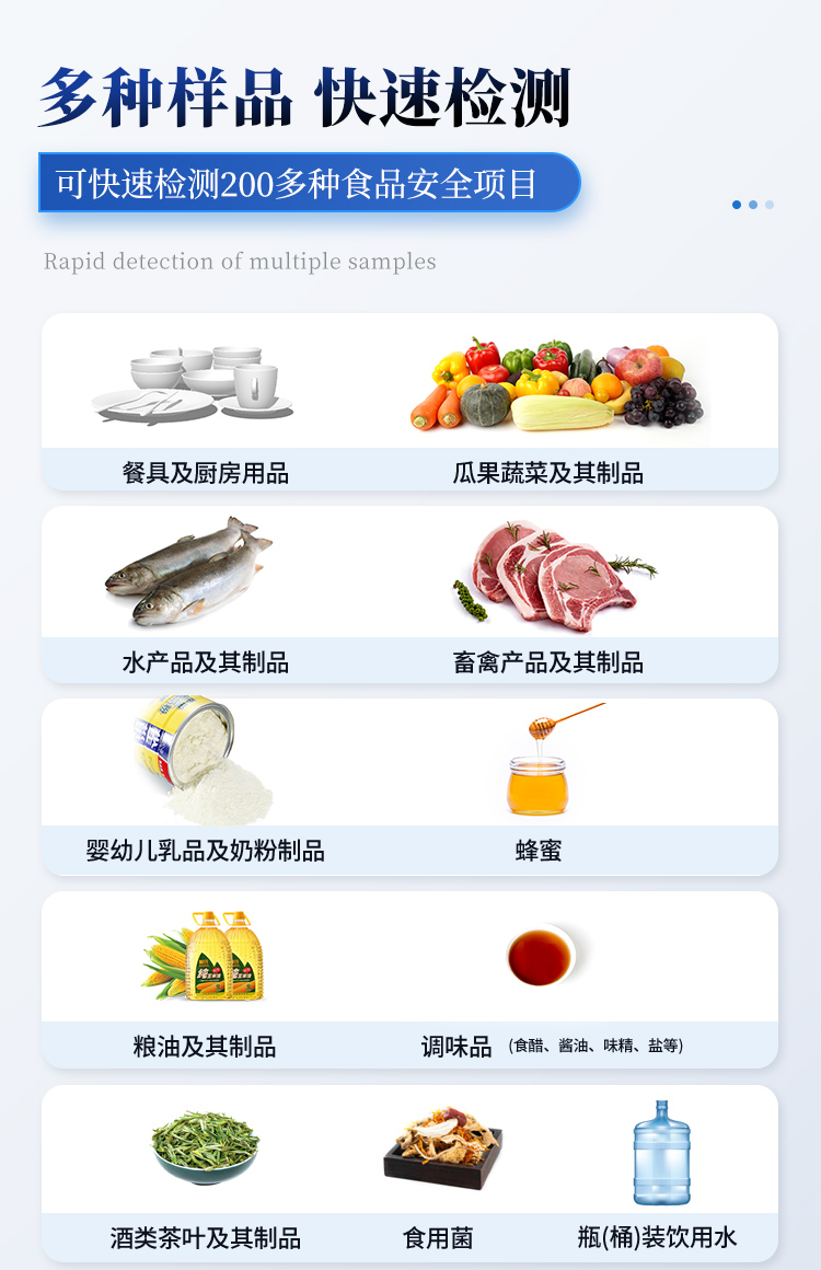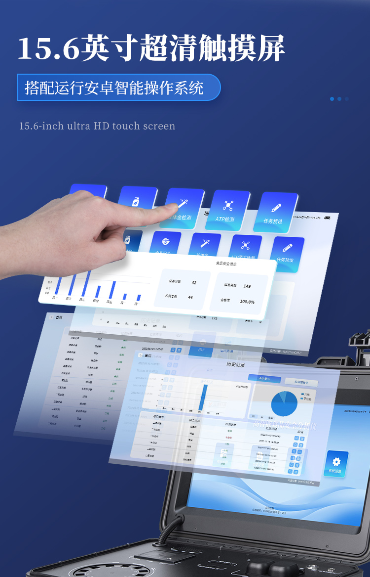 | ◆ 仪器采用10.1英寸液晶触摸屏显,搭配运行安卓智能操作系统,主控芯片采用ARM Cortex-A7,RK3288/4核处理器,主频1.88Ghz,运转速度更快速,性能更强。 | 仪器功能包括:胶体金检测模块、数字化管理模块、无线通讯模块等,可以满足同一软件下实现所有检测项目的检测,并在同一窗口展示检测结果。 | ◆ 一体化台式快检设备,采用交直流两用供电方式,可连接车载电源,配备6ah大容量充电锂电池,可以满足现场及流动检测使用的需求。 | ◆ 系统自带数据集成模块,设备首页自动统计检测数据包含:周检测数据、月检测数据,全部检测总数量,均包含检测总数,合格数,不合格数,以及相关柱形分析图,对各项检测数据清晰掌握,无需电脑查询,更加快捷直观。 | ◆ 仪器具有任务预设模块,可在样品送检前提前预设样品名称、检测指标、送检单位等信息,样品送检时一键调取保存信息,检测更加方便快捷。 | ◆ 胶体金检测模块: | ◆ 直插式自动扫描方式,可实时显示金标卡实时图像,系统自动分析并呈现出CT曲线图,CT线自动识别,无需手动调整,完成检测后自动退出检测卡。结果判定线可修改,对照值标定值可保存,断电不丢失数据。 兼容市场上其他胶体金卡,使用耗材不受限制,极大增强用户使用体验。 | 图像调整功能:可根据金标卡读取图像进行多方位调整,使其更精准读取结果。 | ◆ 仪器检测系统拥有庞大数据库,并且构建了完善的检索、修订功能。食品库涵盖多种样品名称,可按需添加或删除、编辑样品名称;产品数据库以及历史检测记录支持一键检索功能。 | ◆ 系统打印自定义化,打印格式多样化,产品合格证(国家标准要求),二维码,抽样信息、检测信息,受检信息、复核信息、抽样日期、检测日期等信息结果,可按需求自行设置打印内容。 | A4纸版本报告打印功能:设备拥有两种结果展示方式,可以自动生成A4打印模板和小票打印模板两种样式,可通过WiFi及网线等方式链接外置打印机可进行打印 | ◆ 仪器具有 wifi 联网上传、RJ45网线连接功能,可以快速上传数据。同步对接监管平台,数据可局域网和互联网数据上传,检测结果直接传至食品安全监管平台。进行区域食品安全监管及大数据分析处理与数据统计,检测区域食品安全长短期动态,达到食品安全问题预估、预警。 | ◆ 设备支持U盘存储,标准USB接口,免驱动安装。检测结果存储容量20万条以上,可生成Excel表格,进行一键拷贝,并具有登录保护功能,可设置用户名及密码,规范不同人员操作权限,防止非工作人员操作,并且可以进行重新校准、锁定、恢复出厂设置功能。仪器固件可升级,后期检测项目可扩充。 | ◆ 仪器具备远程升级功能,可定向分客户分仪器更新,开机后自动更新,并可持续性免费更新系统版本,无需像传统产品返厂更新,节省时间及人力成本并避免了物流运输返厂升级导致设备损坏的潜在风险。 |