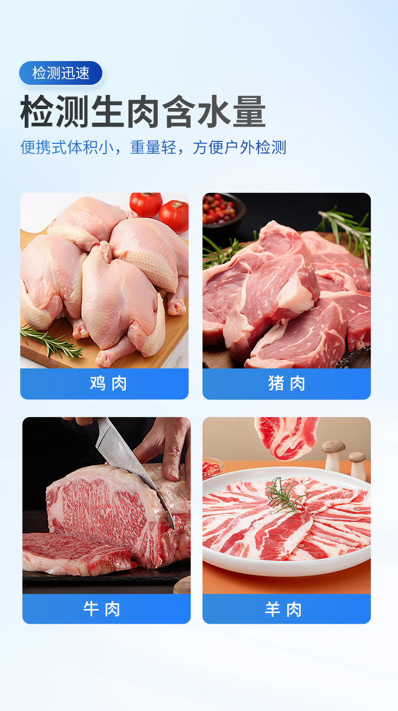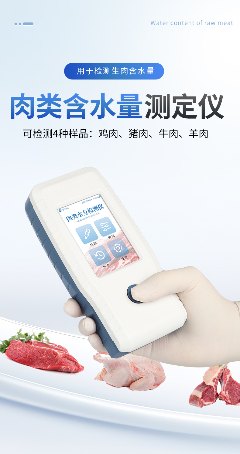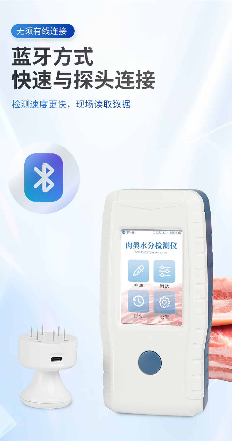 | 检测生肉含水量,可检测4种样品:鸡肉、猪肉、牛肉、羊肉。 | ◆ 使用交流阻抗法进行检测,向鲜肉注入高频电信号进行测量,具有检测速度快,重复性好,对样品损伤小等优点。 | 测量范围:65%~85% | 分辨率:0.1% | 精度:3% | 重复性:0.5% | 不连接充电器的续航时间:探头3小时,手持机5小时。 |