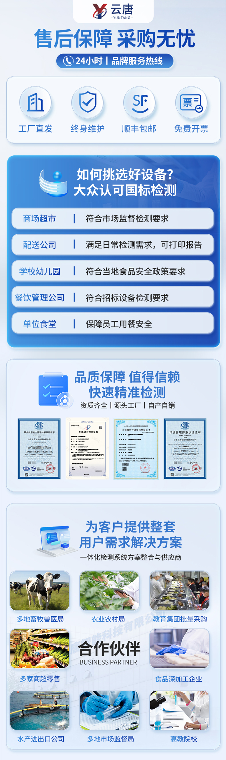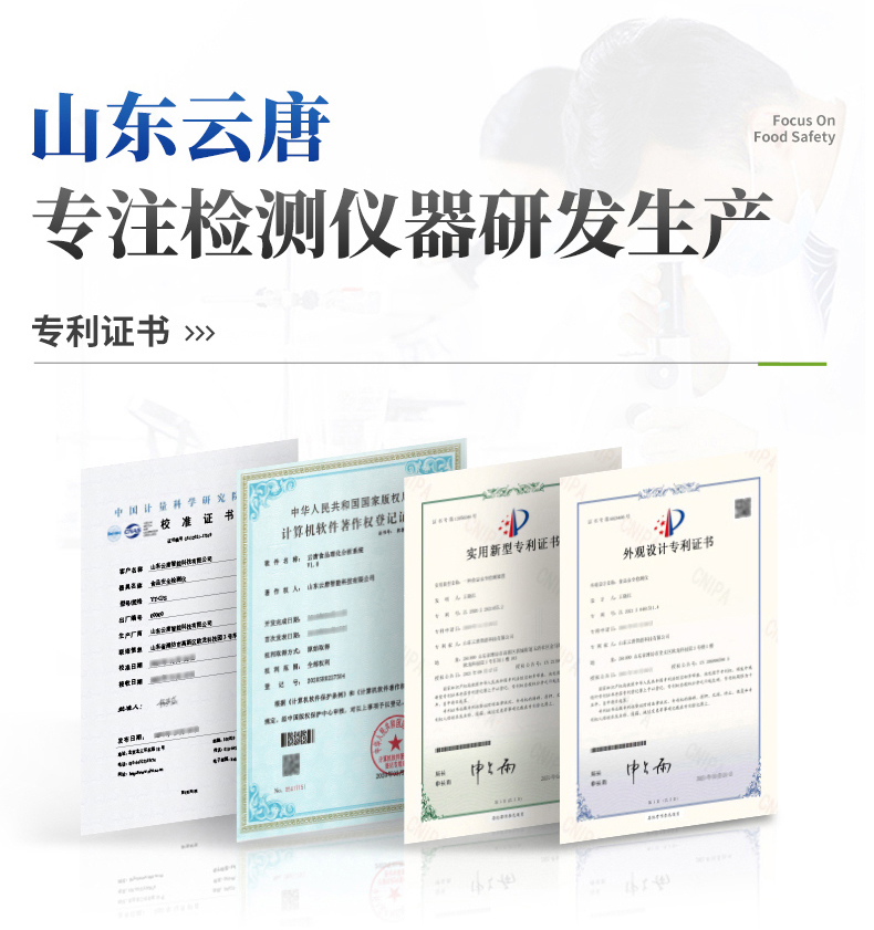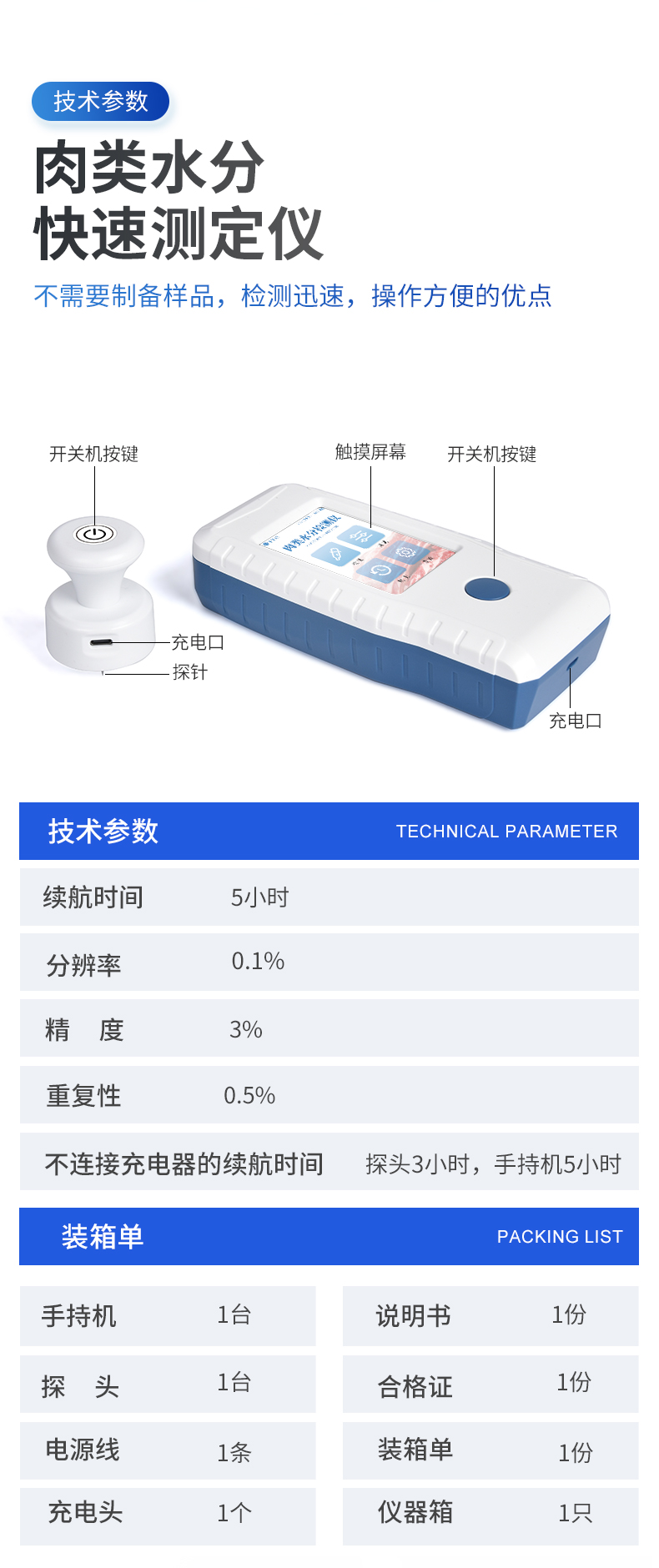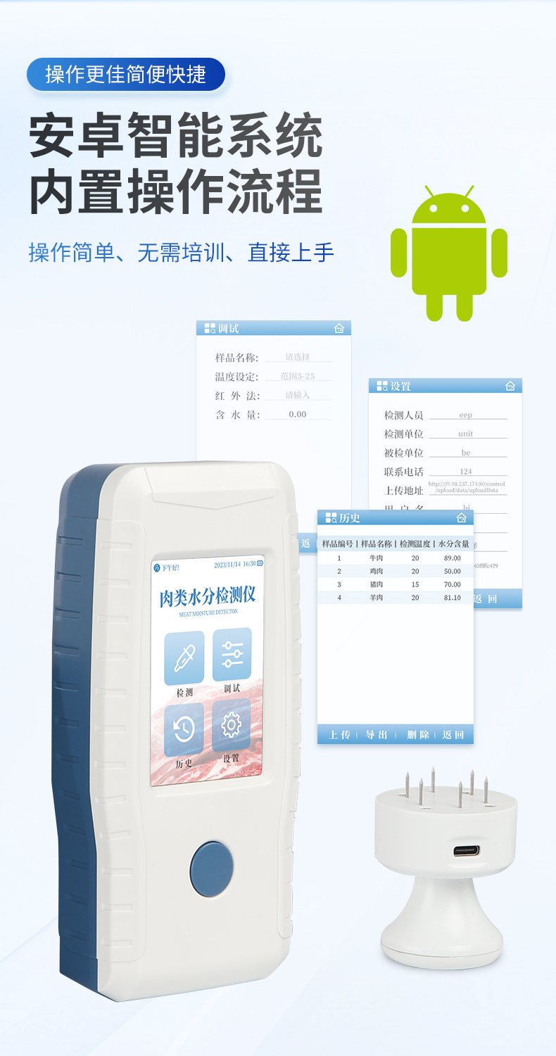 | 检测生肉含水量,可检测4种样品:鸡肉、猪肉、牛肉、羊肉。 | ◆ 使用交流阻抗法进行检测,向鲜肉注入高频电信号进行测量,具有检测速度快,重复性好,对样品损伤小等优点。 | 测量范围:65%~85% | 分辨率:0.1% | 精度:3% | 重复性:0.5% | 不连接充电器的续航时间:探头3小时,手持机5小时。 |