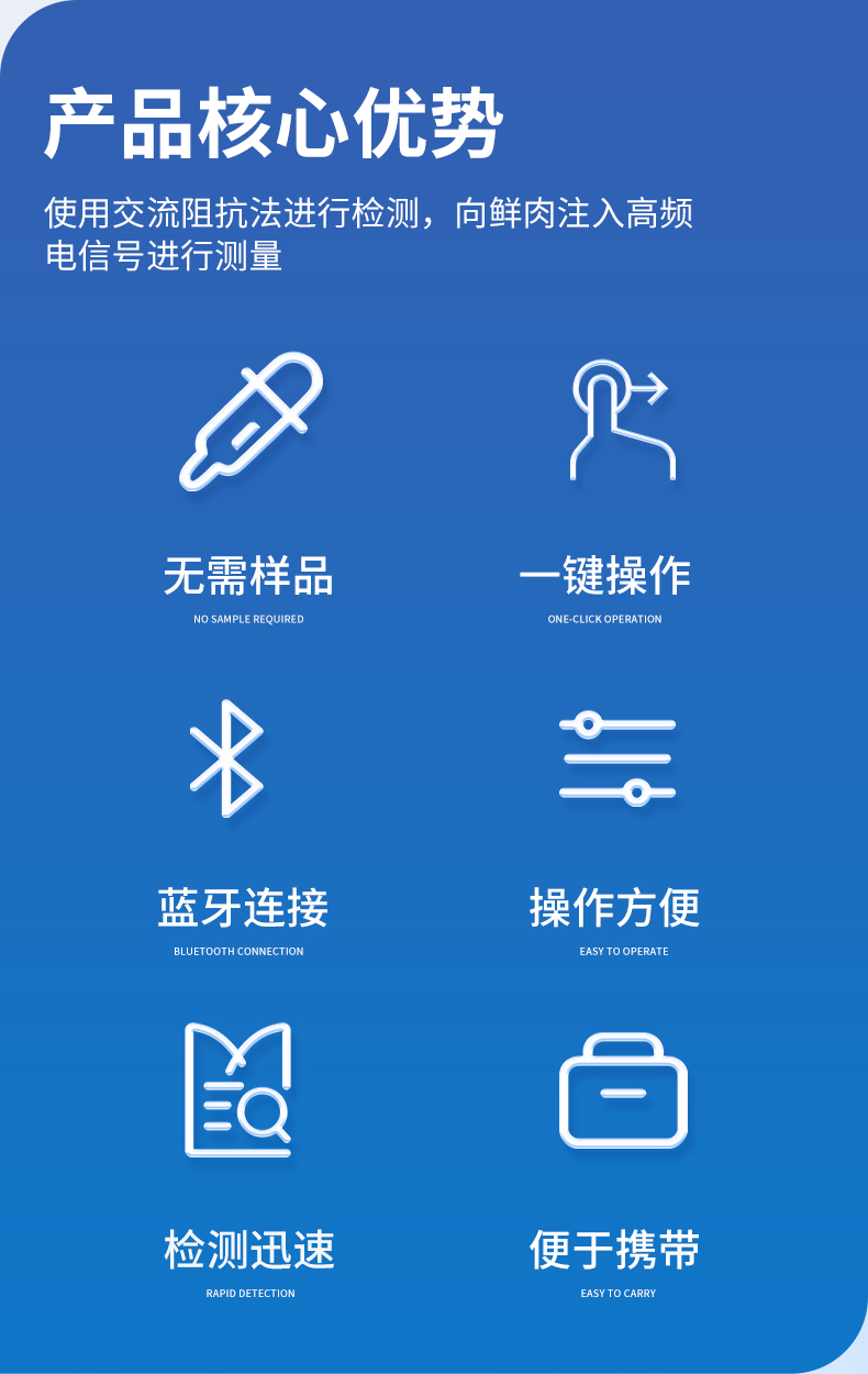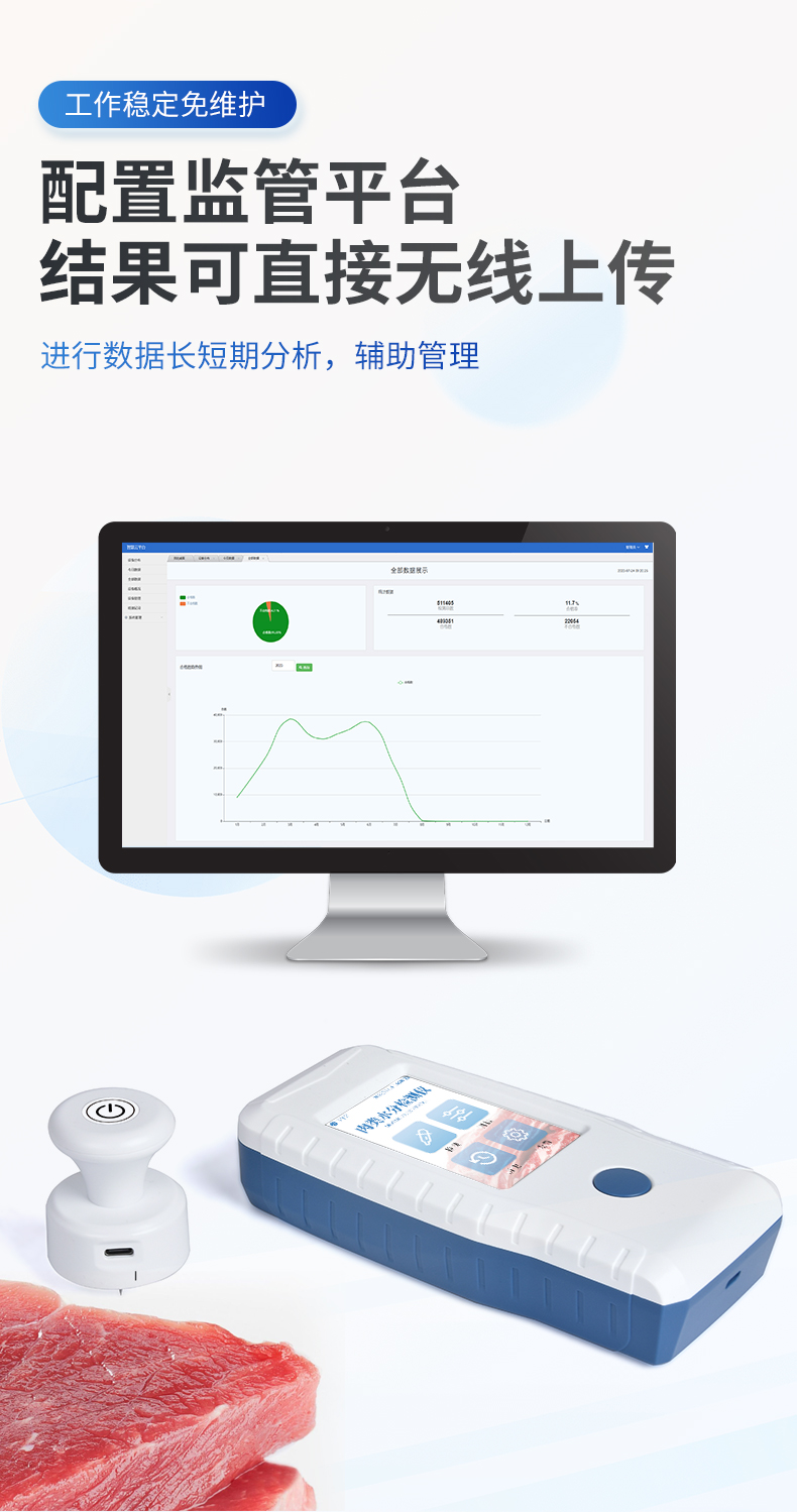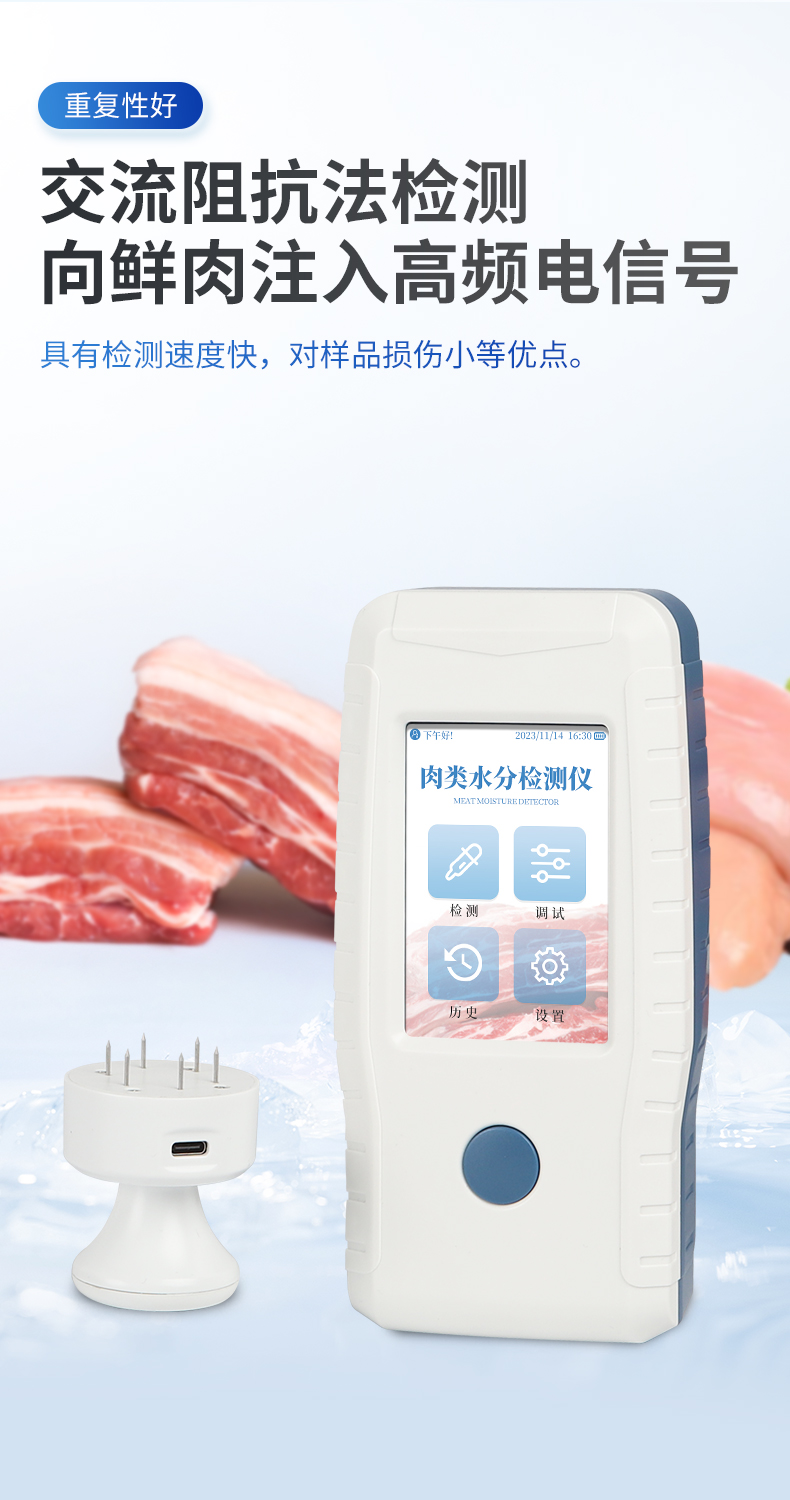 肉类含水量测定仪通过向样品注入高频电信号并接收回波测量生肉含水量,相比GB18394-2020国标文件中的5.2节红外线干燥法(快速法)更快速便捷,具有不需要制备样品,检测迅速,操作方便的优点。