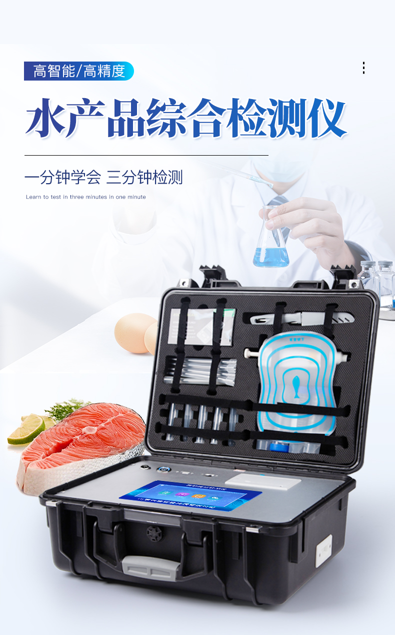 该设备可快速检测鱼、虾等水产类中的氯霉素、孔雀石绿、四环素类、硝基呋喃类、磺胺类、喹诺酮沙星类、氟苯尼考、土霉素、金霉素、甲砜霉素、地西泮等快速检测,如氯霉素快速检测卡整个检测过程只需要30分钟左右, 灵敏度为 0.3 μg/kg (ppb)。该快速检测系统设备为集成化食品安全快速检测分析设备,广泛应用于农贸市场、海鲜市场、食品肉产品深加工企业、食药监局、卫生部门、水产养殖场、检验检疫部门、农业部门、第三方机构等单位使用。