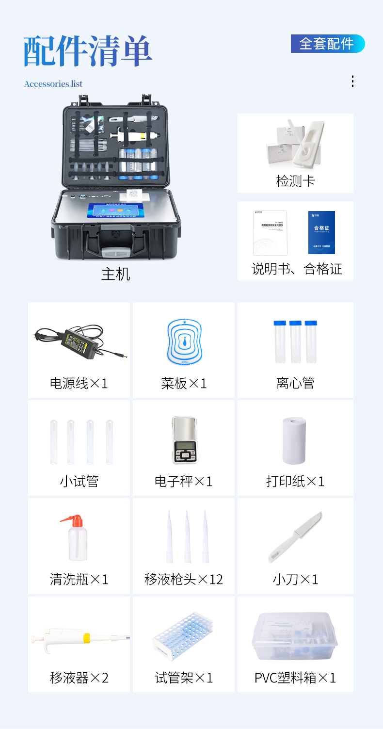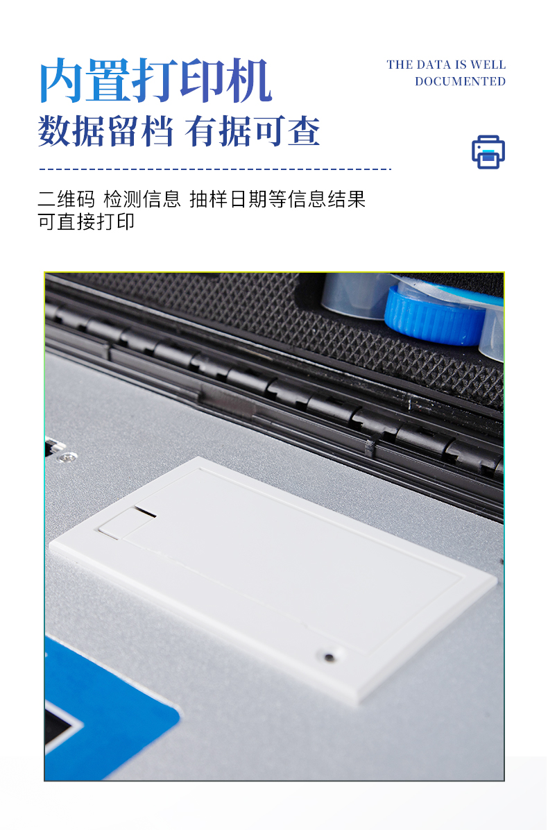 | ◆ 安卓智能系统,采用更加**UI交互界面,操作交互性体验更好,使用更方便。 | ◆ 仪器具有wifi、蓝牙、4G联网传输,数据可无线上传,还具有网线连接功能。 | 智能化程度高,仪器具有自检功能:具有开机自检和调零功能,具有自动检测重复性功能。 | ◆ ★仪器带有监管平台,数据可局域网和互联网数据上传,检测结果直接传至食品安全监管平台。进行区域食品安全监管及大数据分析处理与数据统计,检测区域食品安全长短期动态,达到食品安全问题预估、预警 | ◆ 一体化便携式快检设备,满足现场及流动检测使用需求,能够在同一软件下实现所有检测项目的检测,并可通过同一窗口直观显示检测结果。 | 胶体金模块检测方式:轨道式自动传输扫描,检测完成后自动退出检测卡。 | ◆ ★仪器内置摄像头拍照,可显示金标卡实时图像,系统自动分析并呈现出CT坐标曲线图,CT线自动识别,无需手动调整。 | ◆ 内置强大的数据库,具有多品类多种类样品菜单功能,可灵活选择检测样品,不同的检测通道可同时检测不同的样品项目。也可在仪器上直接编辑录入样品名称、检测指标、送检单位等信息并保存进样品数据库。 | ◆ ★仪器内置操作视频,点击视频模块即可快速学习,是您身边的化验指导专家。 | ◆ 样品处理简单省力,整体操作快速、安全、便捷。 | ◆ 新一代高速热敏打印机,检测完成可自动打印或批量打印检测报告和二维码。 | ◆ ★仪器可配置身份识别功能,通过密码或刷证件开机,防止非工作人员操作等。 | ◆ 高灵敏度,高检测精度,高重复性精度,扫描式高精度光学传感器。 | ◆ 结果判定线可修改,对照值标定值可保存,断电不丢失数据。 | ◆ 兼容市场上所有的胶体金卡,使用耗材不受限制,极大增强用户使用体验。 | ◆ 仪器具有重新校准、锁定、恢复出厂设置功能。 |