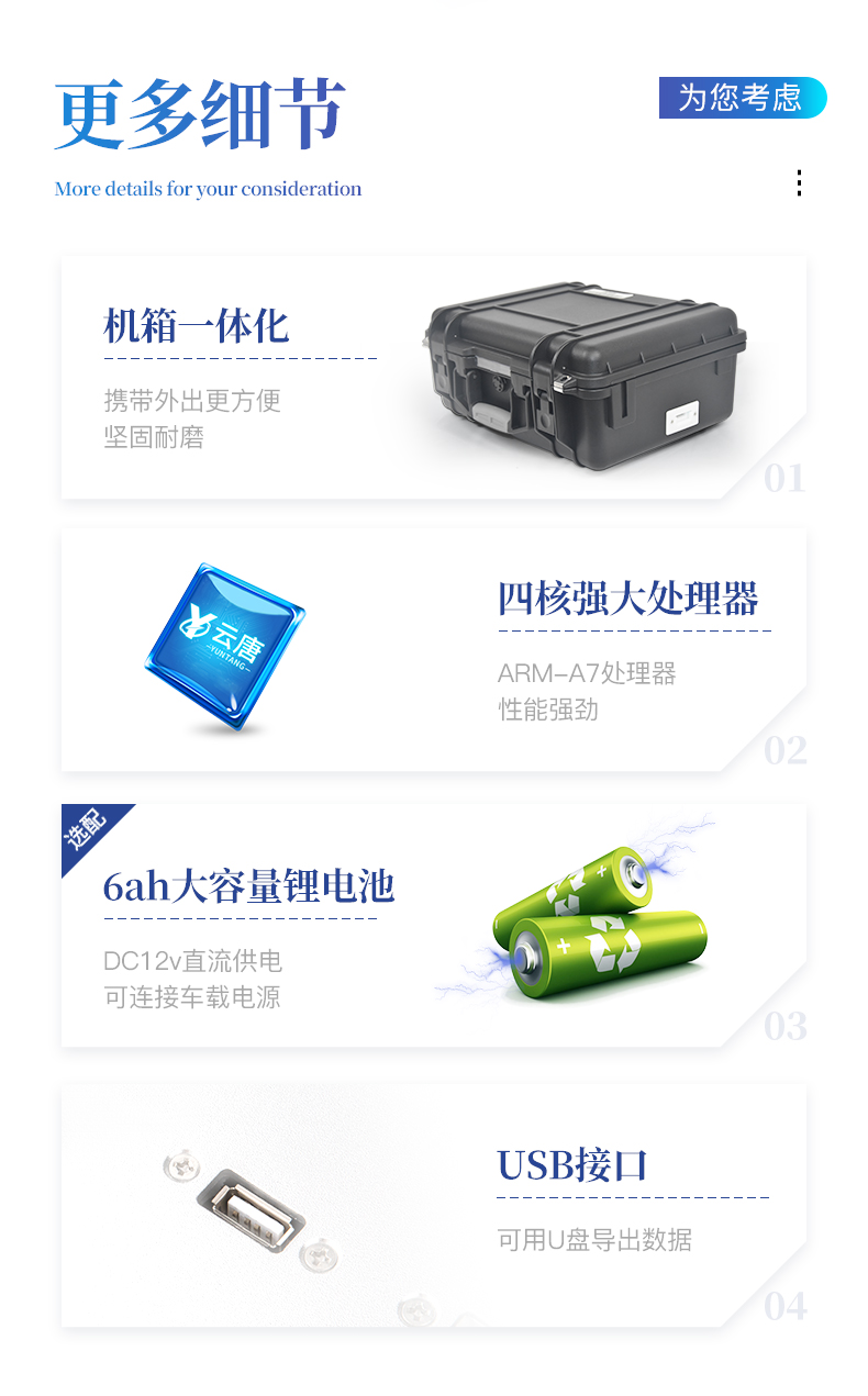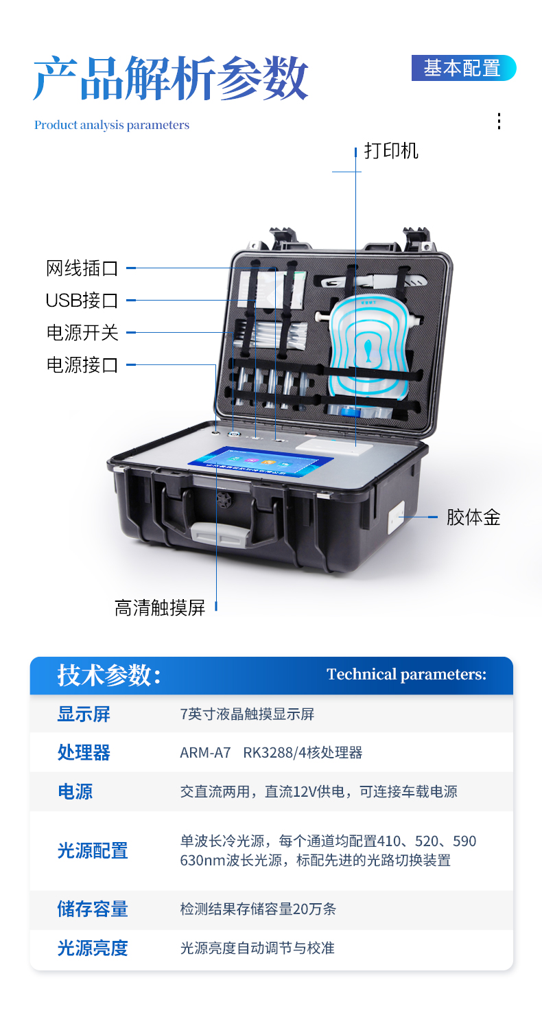 | ◆ 主控芯片采用ARM Cortex-A7,RK3288/4核处理器,主频1.88Ghz,运转速度更快速,稳定性更强。 | 显示方式:7英寸液晶触摸屏显示,人性化中文操作界面,读数直观、简单。 | ◆ 交直流两用,直流12V供电,可连接车载电源,可配6ah大容量充电锂电池,方便户外流动测试。 | ◆ 智能恒流稳压,光强自动调节与校准,长时间连续工作光源无温漂现象。 | ◆ ★内置新国家限量标准,与所测结果进行现场比对,并持续更新标准。 | ◆ 不间断进样,连续检测 | ◆ 样本编号自动累加。 | ◆ 数据无线上传平台,并可从平台导出为Excel表格。 | ◆ 检测结果存储容量20万条。 | ◆ ★同时支持U盘拷贝,标准USB接口,免驱动插拔。 | ◆ 检测项目可扩充,固件可升级 | 仪器尺寸:43×35×19cm, 主机净重:5.2kg | 仪器包装尺寸:550*245*375cm, 包装重量:6.8kg |