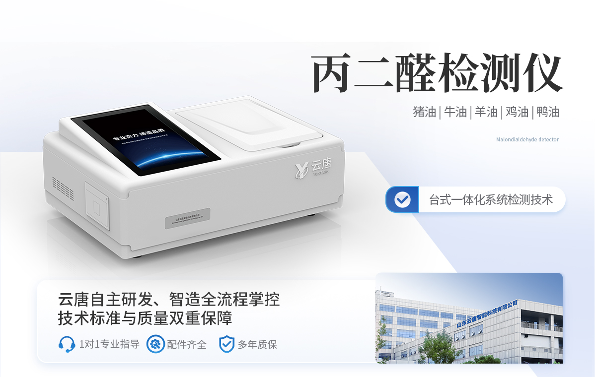 山东云唐智能科技有限公司生产的丙二醛检测仪为集成化食品安全快速检测分析设备,采用台式一体化设计,能够快速检测食用动物油脂包括食用猪油、牛油、羊油、鸡油和鸭油等油脂中的丙二醛含量;仪器预留其他项目检测程序和端口,根据日后需求可进行远程升级。