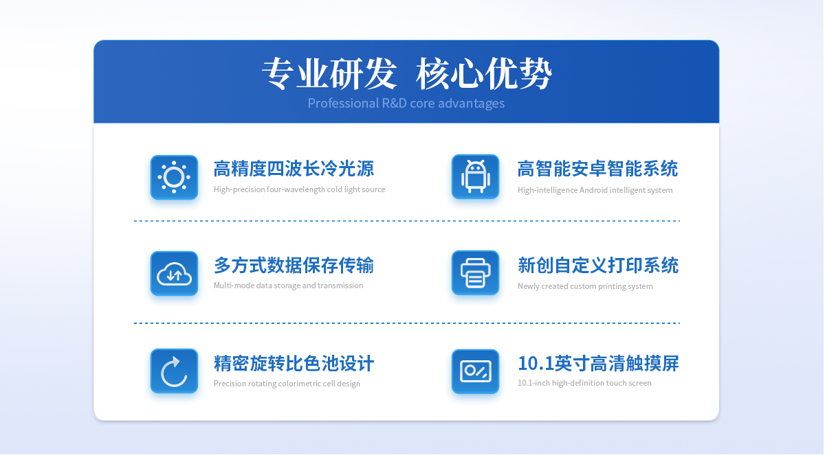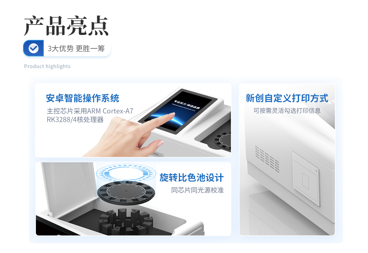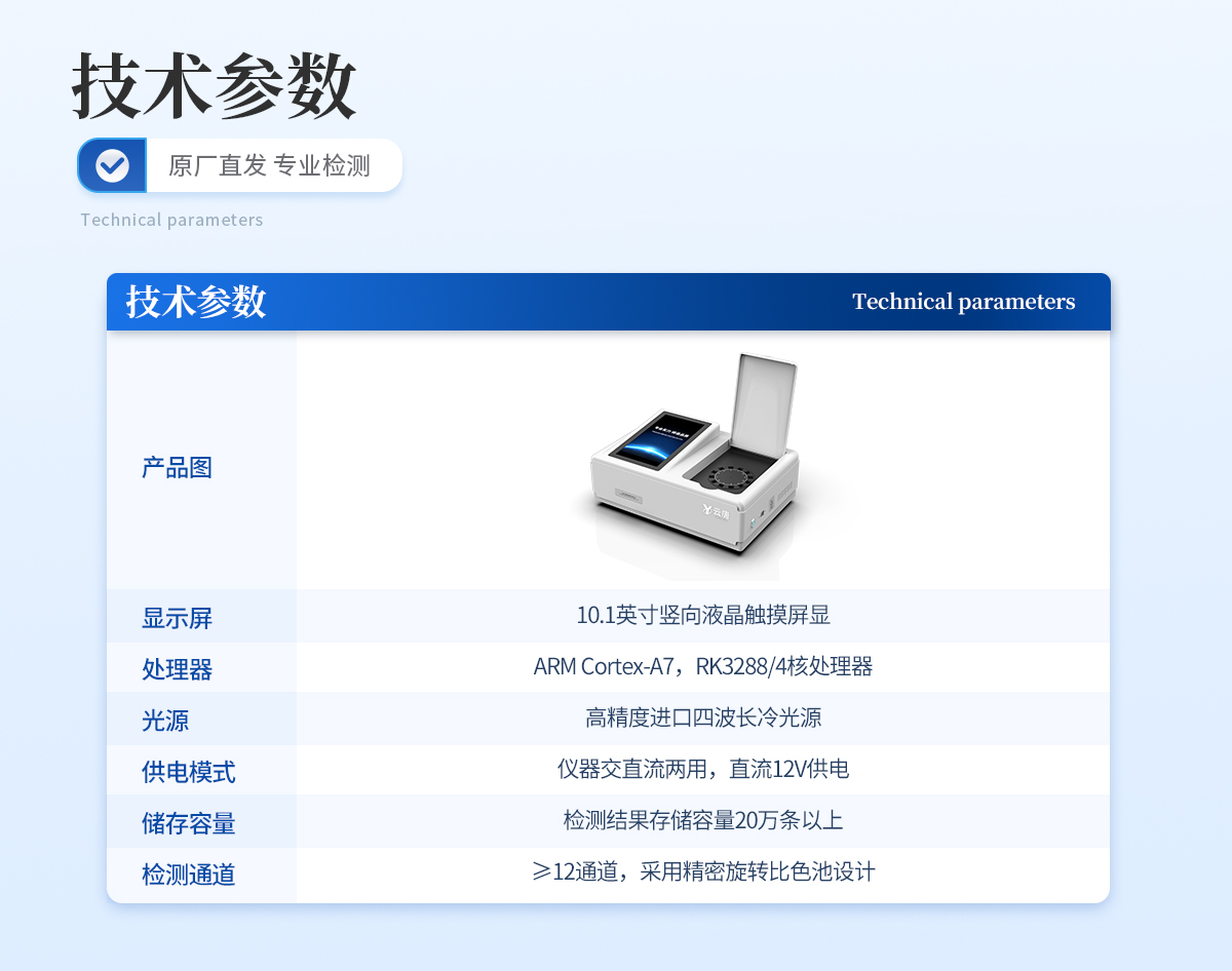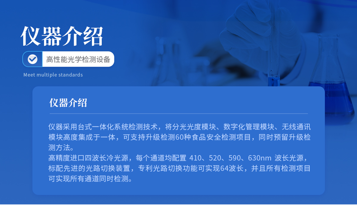 | ◆ 仪器采用台式一体化系统检测技术,将分光光度模块、数字化管理模块、无线通讯模块高度集成于一体,可支持升级检测60种食品安全检测项目,同时预留升级检测方法。 | ◆ 仪器检测模块标准化、智能化,检测项目可随意自由组合。检测箱体内置多个标准检测单元,检测模块可以调整配置。 | 显示屏幕:仪器采用10.1英寸竖向液晶触摸屏显,搭配运行安卓智能操作系统,主控芯片采用ARM Cortex-A7,RK3288/4核处理器,主频1.88Ghz,操作方便,性能更强。 | 检测通道:≥12通道;采用精密旋转比色池设计,使用同芯片同光源校准精度,解决不同光源之间的误差值,更加准确**。 | 仪器光源:高精度进口四波长冷光源,每个通道均配置 410、520、590、630nm 波长光源,标配**的光路切换装置,专利光路切换功能可实现64波长,并且所有检测项目可实现所有通道同时检测。 | ◆ 设备可一键校准,自动保存校准数据,自动对比校验,得到精准光源,采用Android SP存储数据,光源数据永不丢失,方便每一次使用。 | 通讯接口:配备无线通信模块、4G(APN)通讯模块、蓝牙传输,同时具有双USB接口以及RJ45网线接口,可以多方式实现数据保存及数据传输。 | 存储方式:支持U盘存储,标准USB接口,免驱动安装。检测结果存储容量20万条以上,可生成Excel表格进行拷贝,并具有登录保护功能。 | ◆ 智能化操作系统: | 1、操作系统:仪器可在同一检测界面自动对应相关检测通道,一次性选择1-12个样品名称,无需退出界面,节省操作时间。并可以对每个通道属性和样品信息单独进行编辑,例如送检单位、人员,检测人员等,打印时勾选打印显示。 | 2、数据集成系统:设备首页自动汇总分析检测数据,包含:周检测数据、月检测数据,全部检测总数量,均包含检测总数,合格数,不合格数,以及相关柱形分析图,各项检测数据一目了然,无需电脑查询,更加快捷直观。 | 3、数据库系统:十几项数据库分类管理仪器:包含项目类型、项目数据、检测数据、历史记录、国标信息、曲线信息、采样信息、检测信息、受检信息、复核信息、图表信息、光源校准信息、打印样式信息、样品库信息等等,数据库之间互相协调联动保证数据的真实完整性。同时产品数据库以及历史检测记录支持一键检索功能。 | 4、限量规判系统:具有限量查询、添加物质合规判定系统。检测出结果后,系统自动调用系统数据库中相关国标进行比对判定,客观显示判定结果是否合格。 | 5、项目预设系统:仪器具有任务预设模块,一键提前预设,给出方便快捷的新检测方案,每一个任务分别可以设置不同的样品、批次、编号、来源、备注、抽样信息、检测信息、受检信息、复核信息等更多信息。样品送检时一键调取保存信息,并可多次调取,大大提高检测效率。 | 6、数据监管系统:同步对接监管平台,数据可局域网和互联网数据上传,检测结果可选择直接传至食品安全监管平台。进行区域食品安全监管及大数据分析处理与数据统计,检测区域食品安全长短期动态,达到食品安全问题预估、预警。 | 7.1、全新打印系统:内置全新打印机,新创自定义打印方式,可按需灵活勾选控制:二维码,抽样信息、检测信息,受检信息、复核信息、抽样日期、检测日期等信息的打印。 | 7.2、A4纸版本报告打印功能:设备拥有两种结果展示方式,可以自动生成A4打印模板和小票打印模板两种样式,可通过WiFi及网线等方式链接外置打印机可进行打印。 | 供电模式:仪器交直流两用,直流12V供电,可连接车载电源,可配6ah大容量充电锂电池,电量可实时显示,方便户外流动测试。 | ◆ 仪器具备远程升级功能,可定向分客户分仪器更新,开机后自动更新,并可持续性免费更新系统版本,无需像传统产品返厂更新,节省时间及人力成本并避免了物流运输返厂升级导致设备损坏的潜在风险。 |