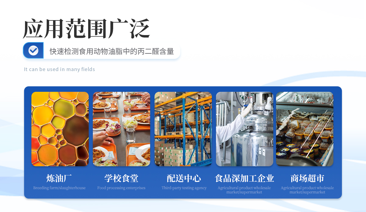 该过丙二醛检测仪为集成化食品安全快速检测分析设备,目前已于市场监管局、食品深加工企业、学校食堂、炼油厂、配送中心、商场超市等单位广泛使用。