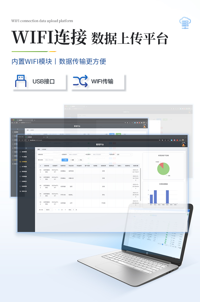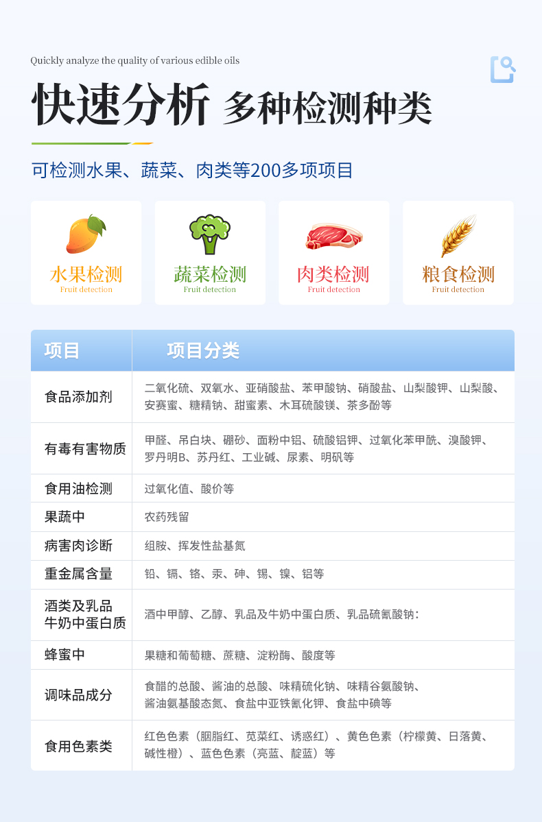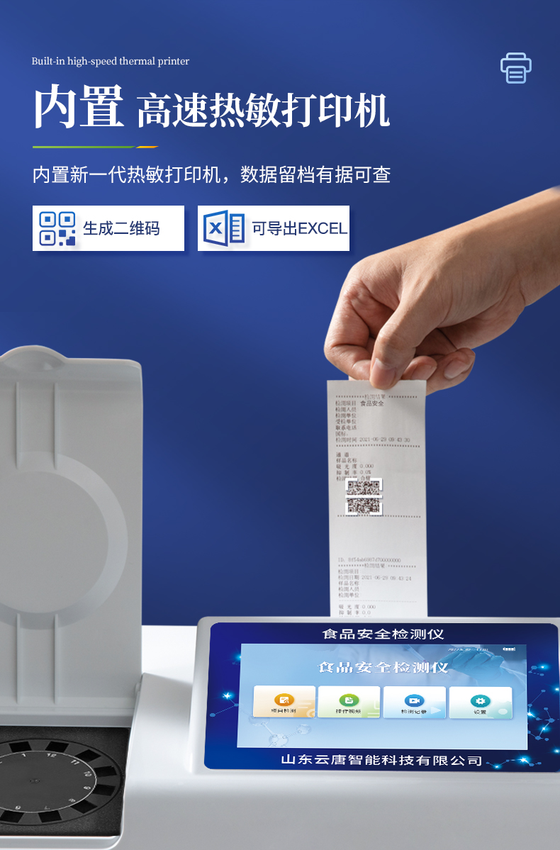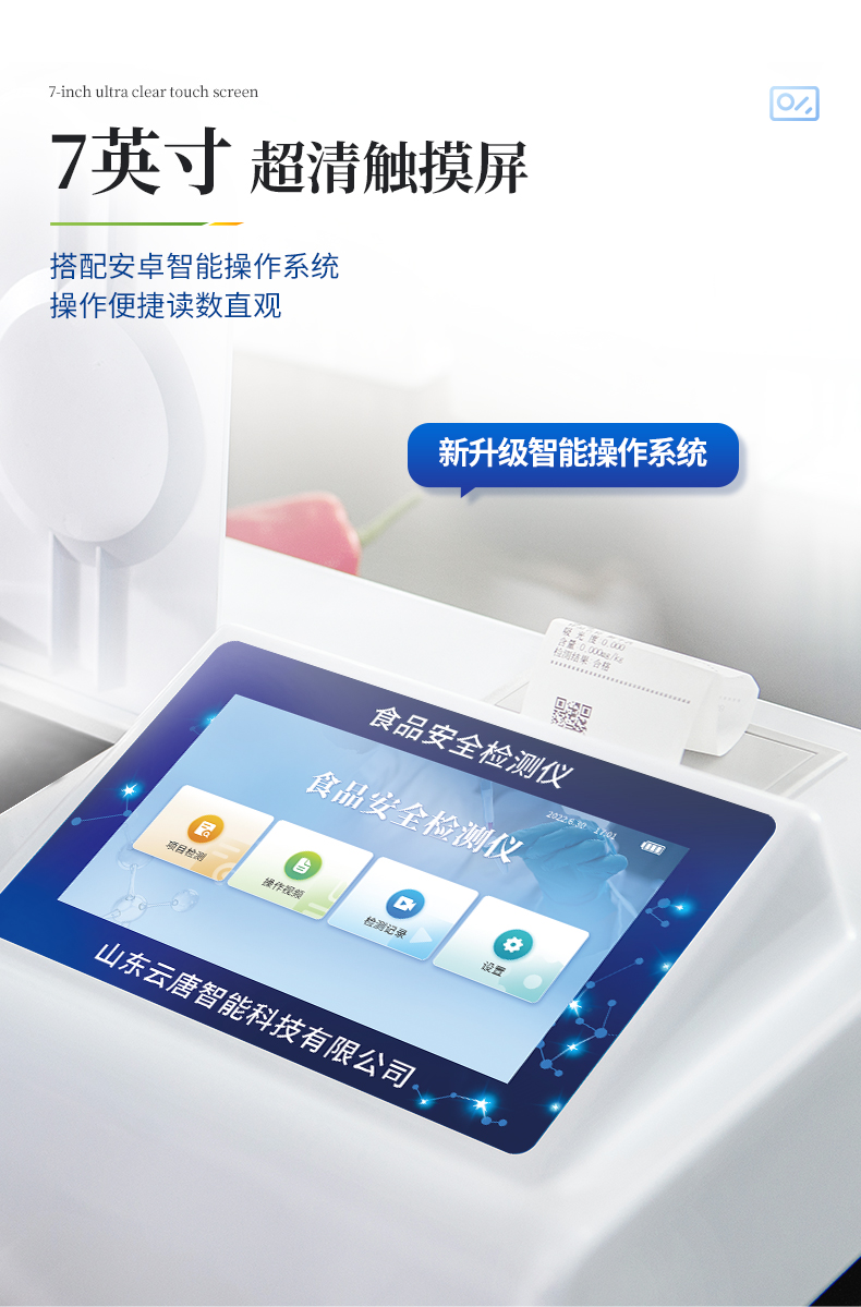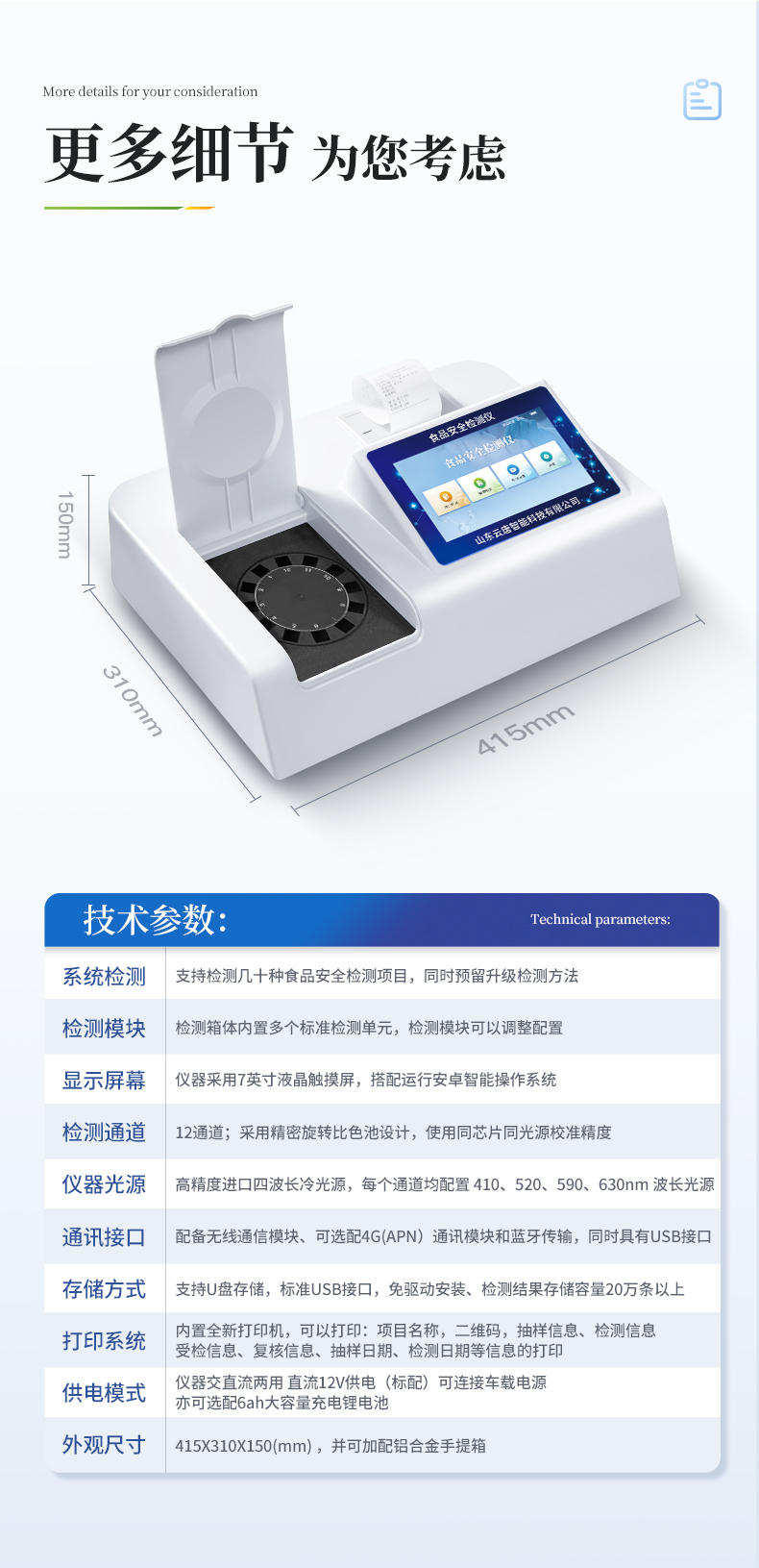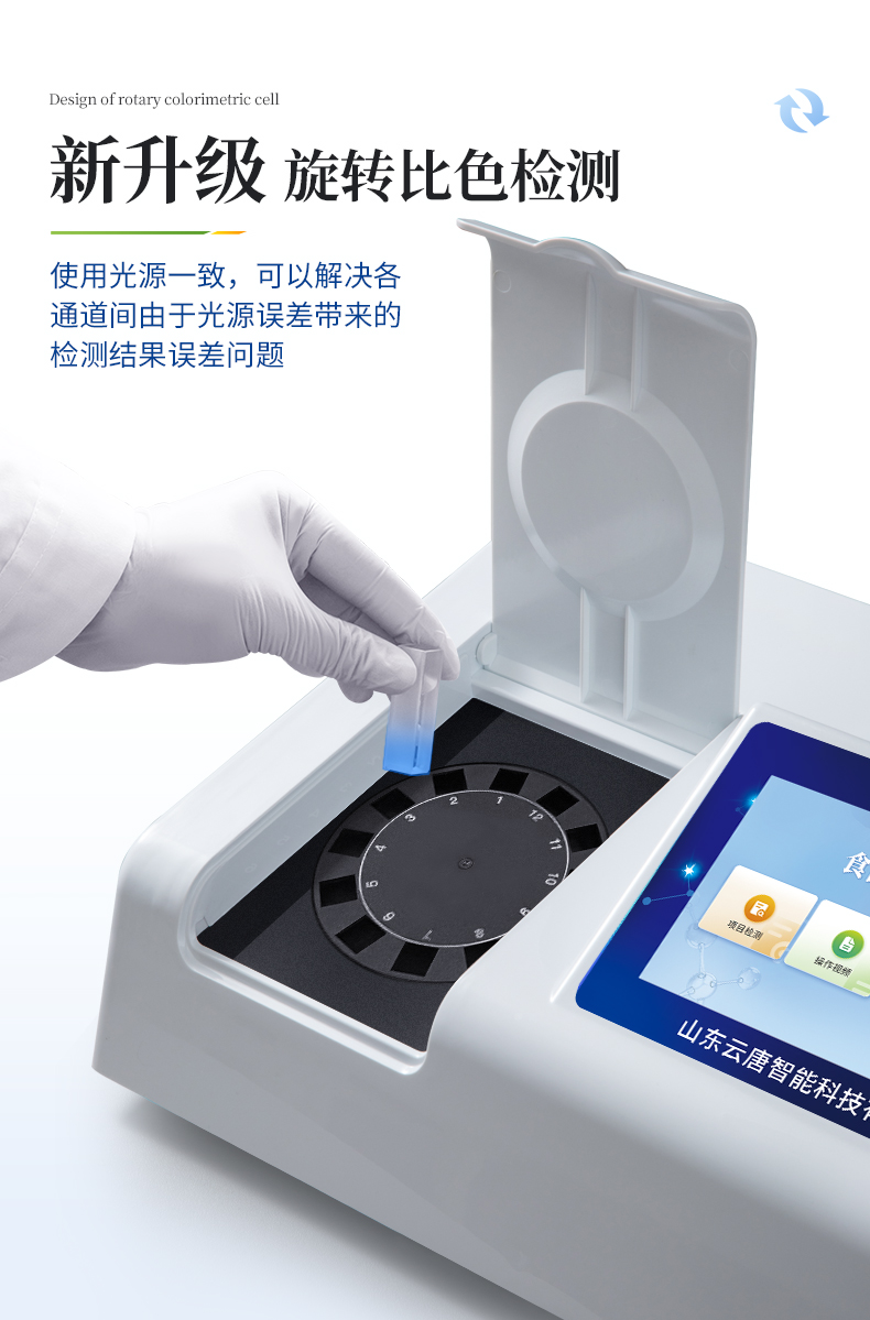 | ◆ 仪器采用台式一体化系统检测技术,将分光光度模块、数字化管理模块、无线通讯模块高度集成于一体,支持检测几十种食品安全检测项目,同时预留升级检测方法。 | ◆ 仪器检测模块标准化、智能化,检测项目可随意自由组合。检测箱体内置多个标准检测单元,检测模块可以调整配置。 | 显示屏幕:仪器采用7英寸液晶触摸屏,搭配运行安卓智能操作系统,主控芯片采用ARM Cortex-A7,RK3288/4核处理器,主频1.88Ghz,操作方便,性能更强。 | 检测通道:≥12通道;采用精密旋转比色池设计,使用同芯片同光源校准精度,解决不同光源之间的误差值,更加准确**。 | 仪器光源:高精度进口四波长冷光源,每个通道均配置 410、520、590、630nm 波长光源,标配**的光路切换装置,专利光路切换功能可实现64波长,并且所有检测项目可实现所有通道同时检测。 | 通讯接口:配备无线通信模块、可选配4G(APN)通讯模块和蓝牙传输,同时具有USB接口,可以多方式实现数据保存及数据传输。 | 存储方式:支持U盘存储,标准USB接口,免驱动安装。检测结果存储容量20万条以上,可生成Excel表格进行拷贝,并具有登录保护功能。 | ◆ 智能化操作系统: | 1、操作系统:仪器可在同一检测界面自动对应相关检测通道,一次性选择1-12个样品名称,无需退出界面,节省操作时间。并可以对每个通道属性和样品信息单独进行编辑,例如送检单位、人员,检测人员等,打印时勾选打印显示。 | 2、限量规判系统:具有限量查询、添加物质合规判定系统。检测出结果后,系统自动调用系统数据库中相关国标进行比对判定,客观显示结果是否合格。 | 3、数据监管系统:同步对接监管平台,数据可局域网和互联网数据上传,检测结果可选择直接传至食品安全监管平台。进行区域食品安全监管及大数据分析处理与数据统计,检测区域食品安全长短期动态,达到食品安全问题预估、预警。 | 4、打印系统:内置全新打印机,可以打印:项目名称,二维码,抽样信息、检测信息,受检信息、复核信息、抽样日期、检测日期等信息的打印。 | 供电模式:仪器交直流两用,直流12V供电(标配),可连接车载电源,亦可选配6ah大容量充电锂电池,电量可实时显示,方便户外流动测试。 | ◆ 仪器具有重新校准、锁定、恢复出厂设置功能, | 外观尺寸:415X310X150(mm) ,并可加配铝合金手提箱 |
