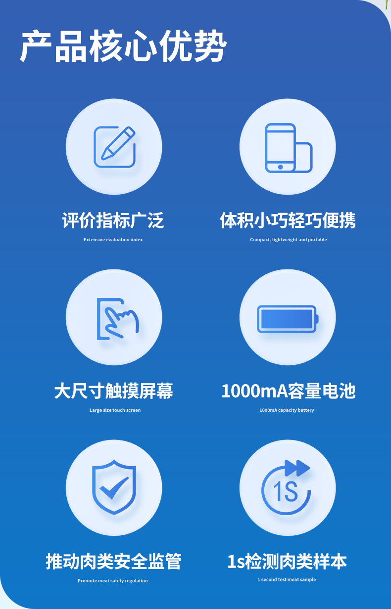 联合中国农业大学彭彦昆教授团队研发的掌上式生鲜肉新鲜度分析仪,可用于检测生鲜肉的TVC、pH、TVB-N、新鲜度、L*、A*、B*等评价指标。Palmarter具有体积小、便 于携带、性价比高等特点,其应用场景包括但不限于肉储运企业、肉品品质监管部门、饭店、超市、菜场、家庭等。